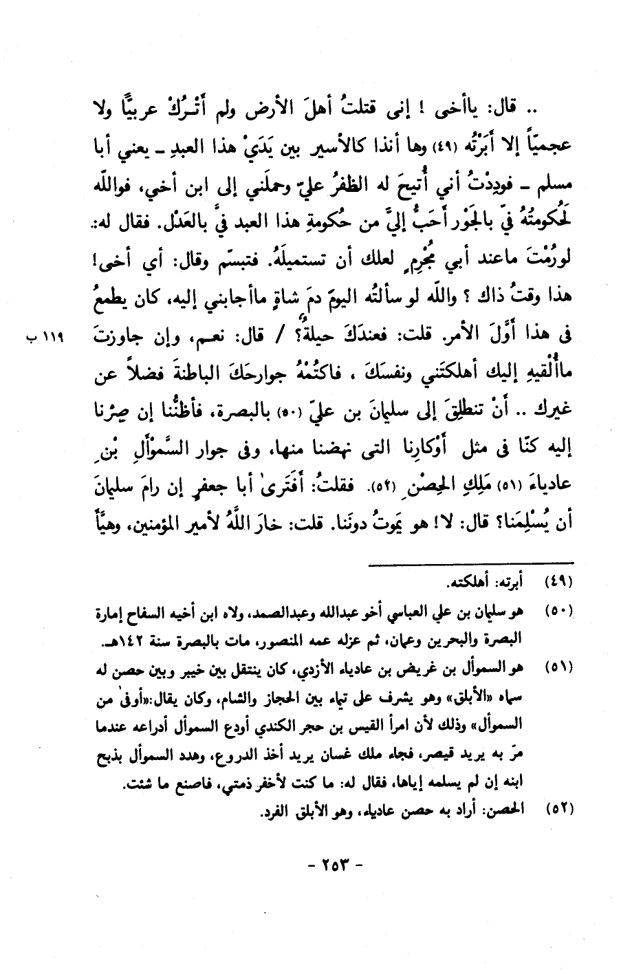 .. قال: يا أخي! إني قتلت أهل الأرض ولم أترك عربياً ولا عجمياً إلا أبرته وها أنذا كالأسير بين يدي هذا العبد –يعني أبا مسلم- فوددت أني أتيح له الظفر علي وحملني إلى ابن أخي, فوالله لحكومته في بالجور أحب إلي من حكومة هذا العبد في بالعدل. فقال له: لو رمت ما عند أبي مجرمٍ لعلك أن تستميله. فتبسم وقال: أي أخي! هذا وقت ذاك؟ والله لو سألته اليوم دم شاةٍ ما أجابني إليه, كان يطمع في هذا أول الأمر. قلت: فعندك حيلةٌ؟/ قال: نعم, وإن جاوزت ما ألقيه إليك أهلكتني ونفسك, فاكتمه جوارحك الباطنة فضلاً عن غيرك.. أن تنطلق إلى سليمان بن علي بالبصرة, فأظننا إن صرنا إليه كنا في مثل أوكارنا التي نهضنا منها, وفي جوار السموأل بن عادياء ملك الحصن. فقلت: أفترى أبا جعفرٍ إن رام سليمان أن يسلمنا؟ قال: لا! هو يموت دوننا. قلت: خار الله لأمير المؤمنين, وهيأ
