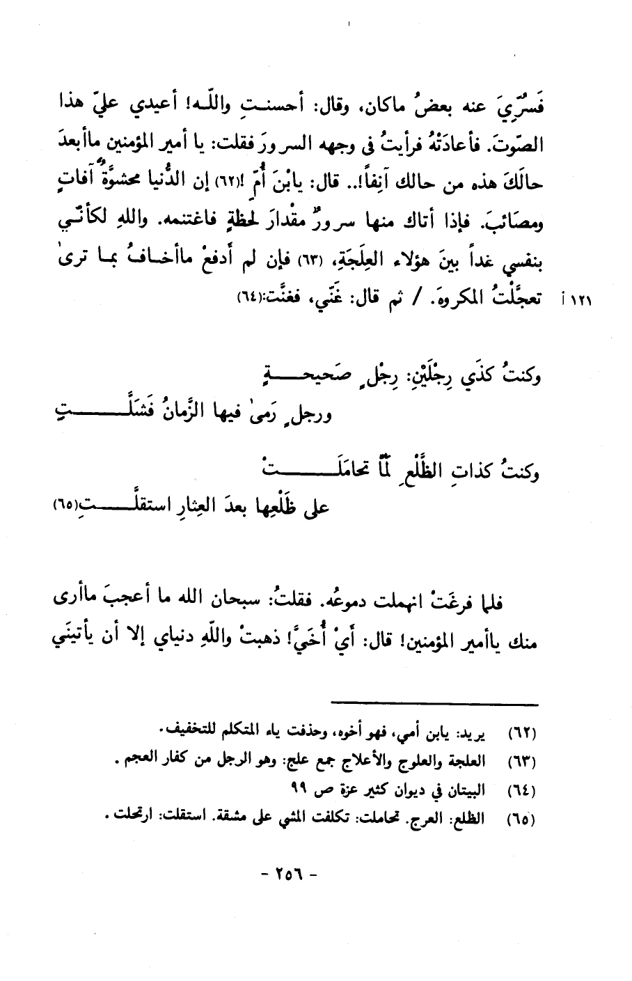 فسري عنه بعض ما كان, وقال: أحسنت والله! أعيدي علي هذا الصوت. فأعادته فرأيت في وجهه السرور فقلت: يا أمير المؤمنين ما أبعد حالك هذه من حالك آنفاً!.. قال: يا بن أم! إن الدنيا محشوةٌ آفاتٍ ومصائب. فإذا أتاك منها سرورٌ مقدار لحظةٍ فاغتنمه. والله لكأني بنفسي غداً بين هؤلاء العلجة, فإن لم أدفع ما أخاف بما ترى تعجلت المكروه./ ثم قال: غني, فغنت: