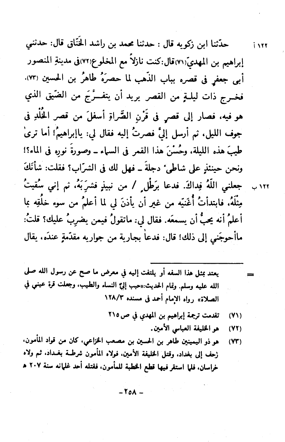 حدثنا ابن زكويه قال: حدثنا محمد بن راشد الخناق قال: حدثني إبراهيم بن المهدي قال: كنت نازلاً مع المخلوع في مدينة المنصور أبي جعفرٍ في قصره بباب الذهب لما حصره طاهر بن الحسين. فخرج ذات ليلةٍ من القصر يريد أن يتفرج من الضيق الذي هو فيه, فصار إلى قصرٍ في قرن الصراة أسفل من قصر الخلد في جوف الليل, ثم أرسل إلي فصرت إليه فقال لي: يا إبراهيم! أما ترى طيب هذه الليلة, وحسن هذا القمر في السماء –وصورة نوره في الماء؟! ونحن حينئذٍ على شاطئ دجلة- فهل لك في الشراب؟ فقلت: شأنك جعلني الله فداك. فدعا برطلٍ/ من نبيذٍ فشربه, ثم إني سقيت مثله, فابتدأت أغنيه من غير أن يأذن لي لما أعلم من سوء خلقه بما أعلم أنه يحب أن يسمعه. فقال لي: ما تقول فيمن يضرب عليك؟ قلت: ما أحوجني إلى ذلك! قال: فدعا بجارية من جواريه مقدمةٍ عنده, يقال