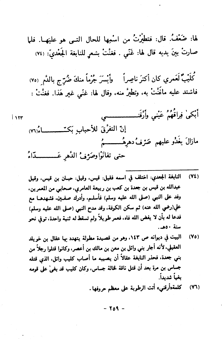 لها: ضعف. قال: فتطيرت من اسمها للحال التي هو عليها. فلما صارت بين يديه قال لها: غني. فغنت بشعرٍ للنابغة الجعدي: