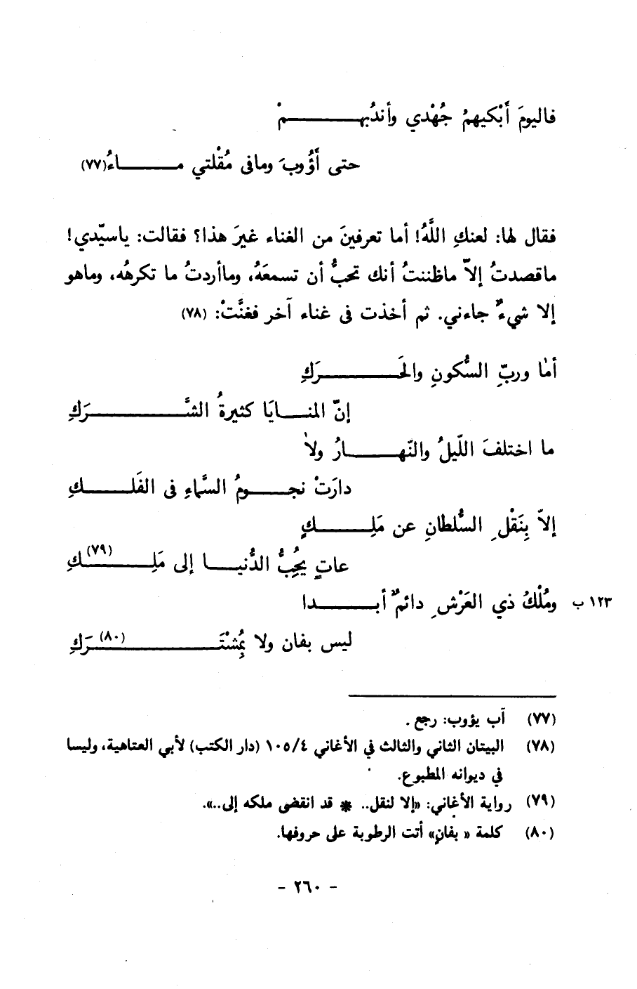 فقال لها: لعنك الله! أما تعرفين من الغناء غير هذا؟ فقالت: يا سيدي! ما قصدت إلا ما ظننت أنك تحب أن تسمعه, وما أردت ما تكرهه, وما هو إلا شيءٌ جاءني. ثم أخذت في غناء آخر فغنت: