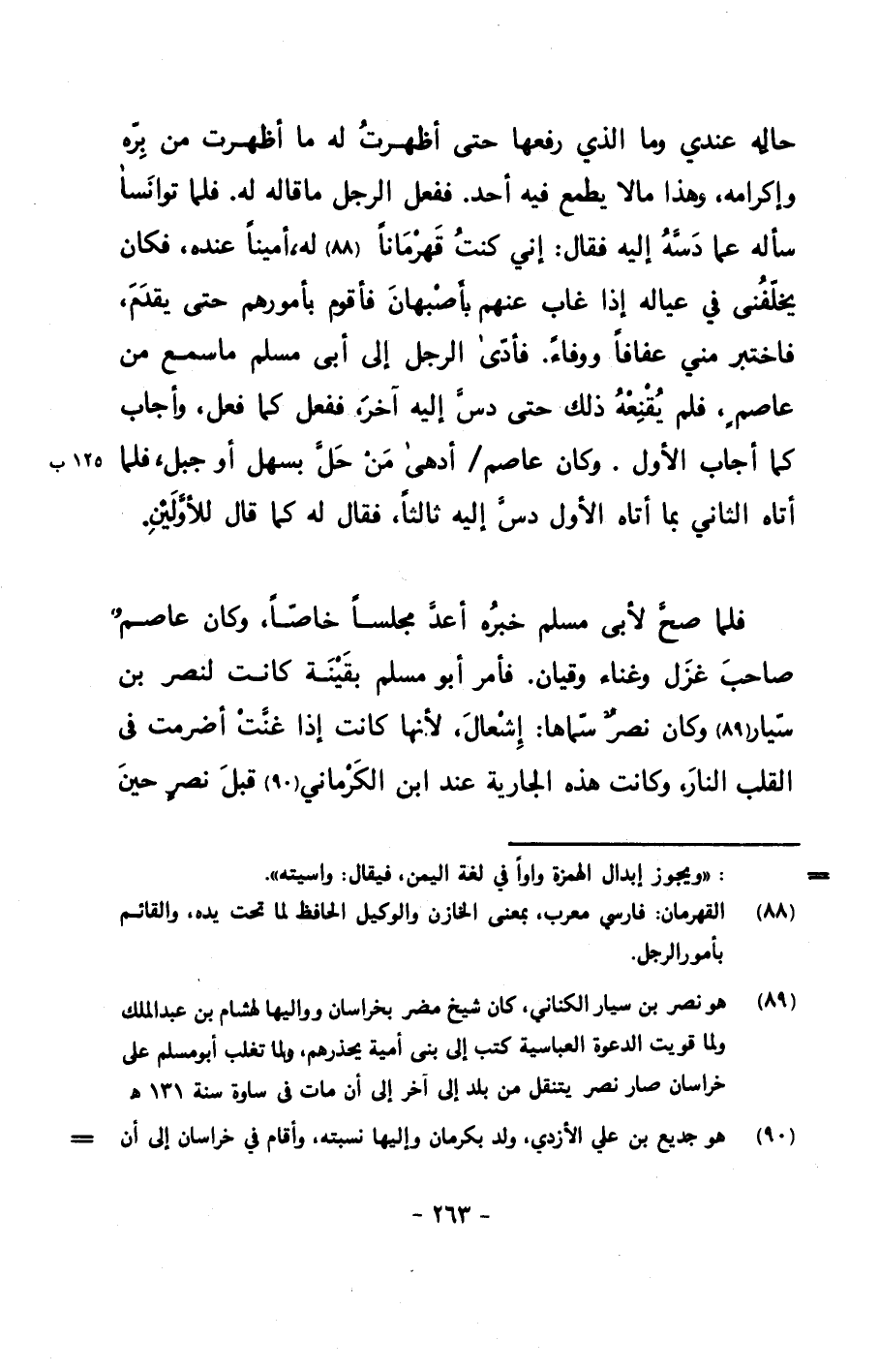 حاله عندي وما الذي رفعها حتى أظهرت له ما أظهرت من بره وإكرامه، وهذا ما لا يطمع فيه أحد. ففعل الرجل ما قاله له. فلما توانسا سأله عما دسه إليه فقال: إني كنت قهرماناً له، أميناً عنده، فكان يخلفني في عياله إذا غاب عنهم بأصبهان فأقوم بأمورهم حتى يقدم، فاختبر مني عفافاً ووفاءً. فأدى الرجل إلى أبي مسلم ما سمع من عاصمٍ، فلم يقنعه ذلك حتى دس إليه آخر، ففعل كما فعل، وأجاب كما أجاب الأول. وكان عاصم/ أدهى من حل بسهل أو جبل، فلما أتاه الثاني بما أتاه الأول دس إليه ثالثاً، فقال له كما قال للأولين.