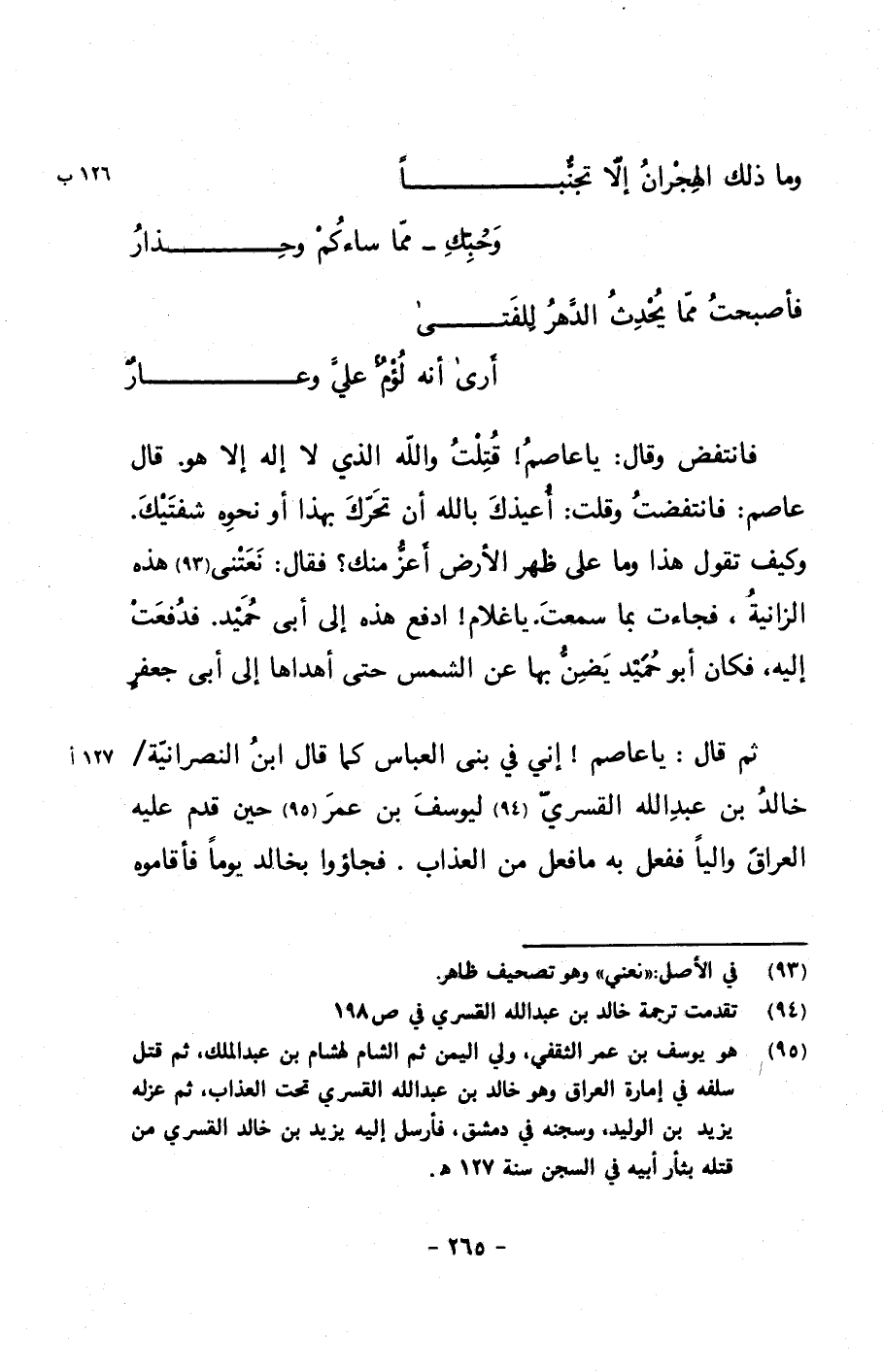 ثم قال: يا عاصم! إني في بني العباس كما قال ابن النصرانية/ خالد بن عبد الله القسري ليوسف بن عمر حين قدم عليه العراق والياً ففعل به ما فعل من العذاب. فجاؤوا بخالد يوماً فأقاموه