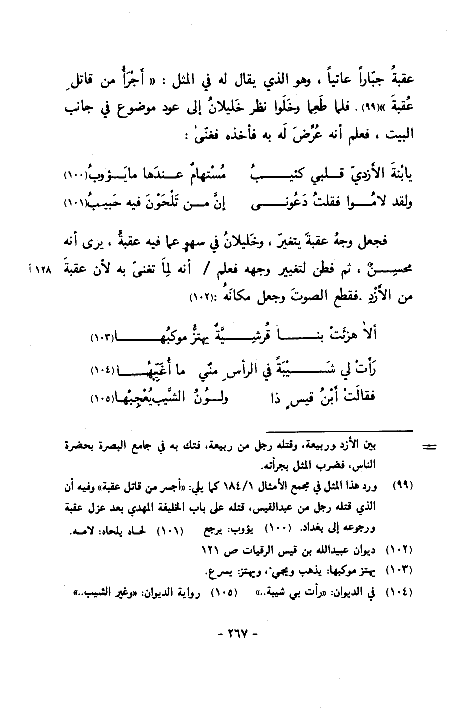 فجعل وجه عقبة يتغير، وخليلان في سهوٍ عما فيه عقبة، يرى أنه محسنٌ، ثم فطن لتغيير وجهه فعلم/ أنه لما تغنى به لأن عقبة من الأزد. فقطع الصوت وجعل مكانه: