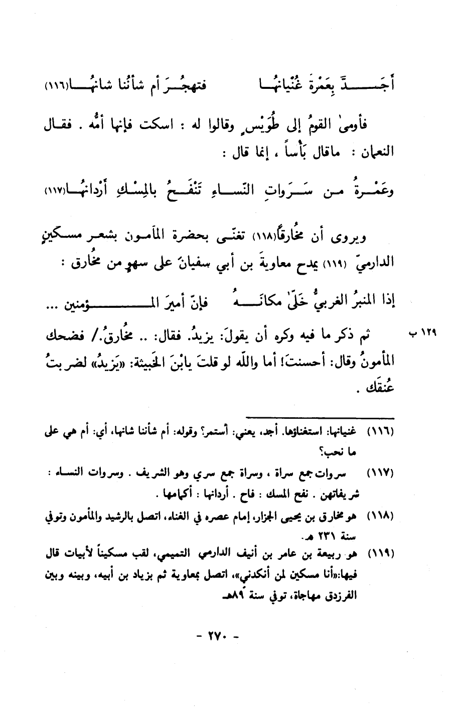 ثم ذكر ما فيه وكره أن يقول: يزيد. فقال:.. مخارق./ فضحك المأمون وقال: أحسنت! أما والله لو قلت يا بن الخبيثة: ((يزيد)) لضربت عنقك.