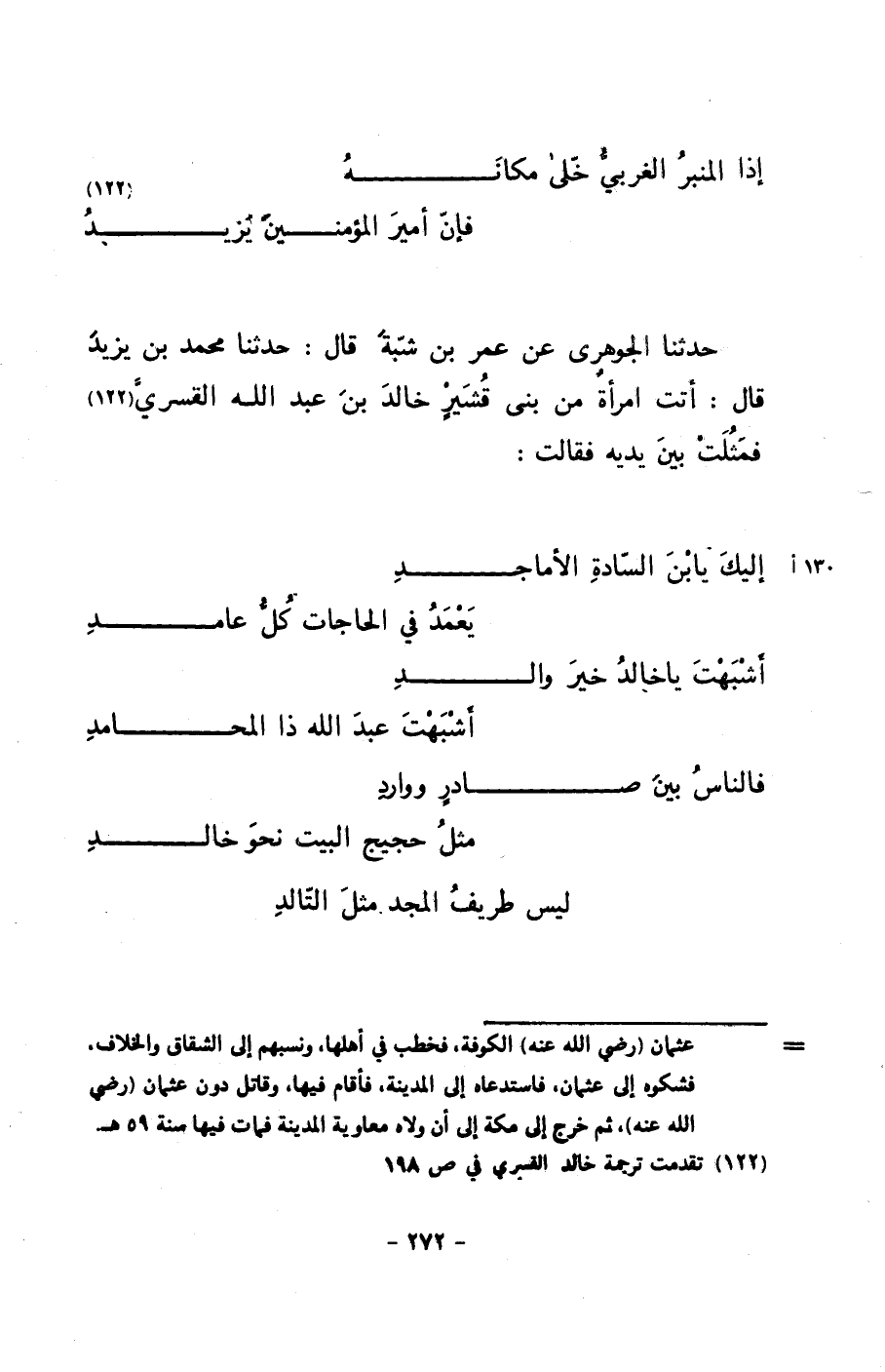 حدثنا الجوهري عن عمر بن شبة قال: حدثنا محمد بن يزيد قال: أتت امرأةٌ من بني قشيرٍ خالد بن عبد الله القسري فمثلت بين يديه فقالت: