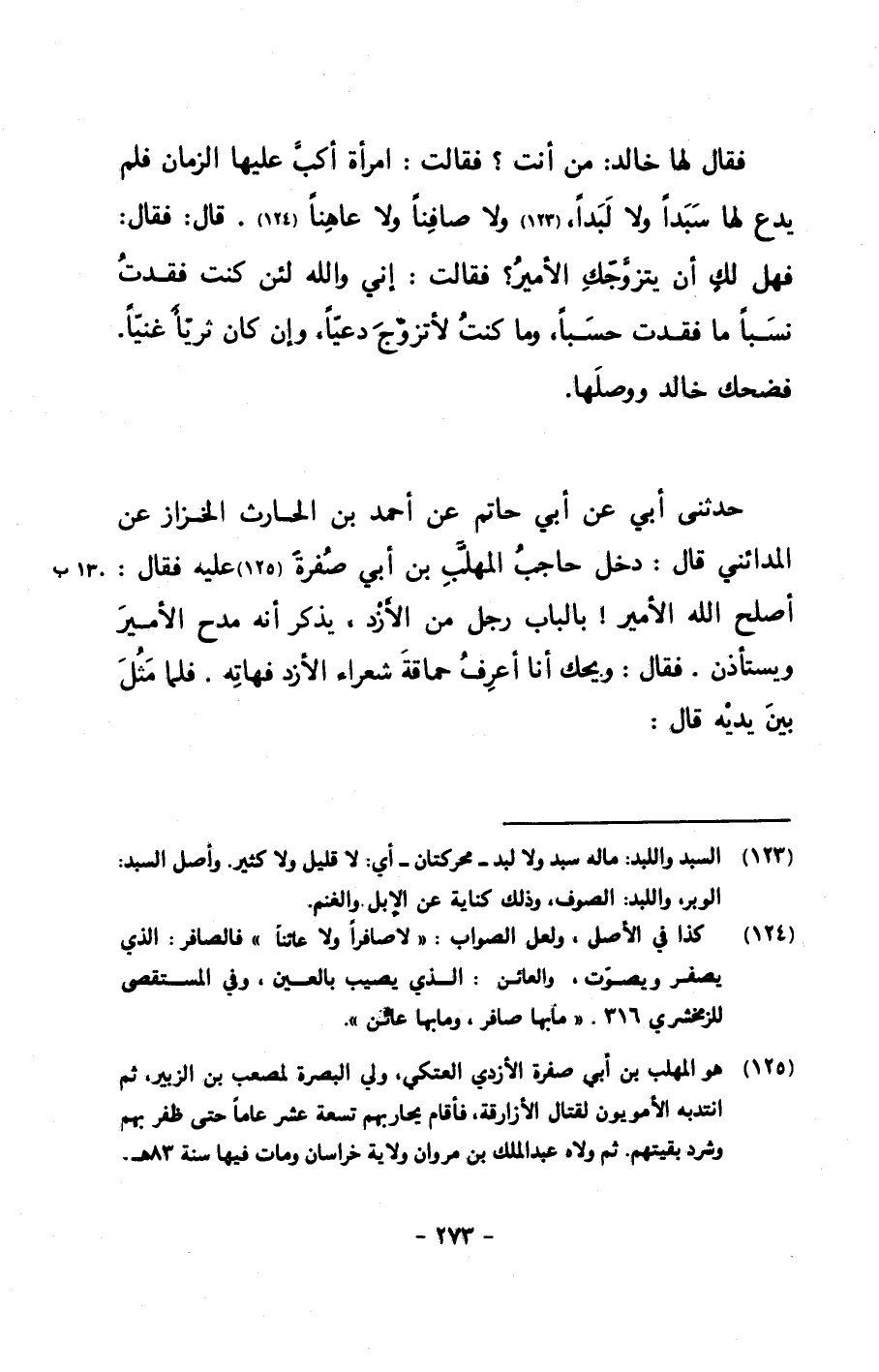 فقال لها خالد: من أنت؟ فقالت: امرأة أكب عليها الزمان فلم يدع لها سبداً ولا لبداً, ولا صافناً ولا عاهناً. قال: فقال: فهل لك أن يتزوجك الأمير؟ فقالت: إني والله لئن كنت فقدت نسباً ما فقدت حسباً, وما كنت لأتزوج دعياً, وإن كان ثرياً غنياً. فضحك خالد ووصلها.