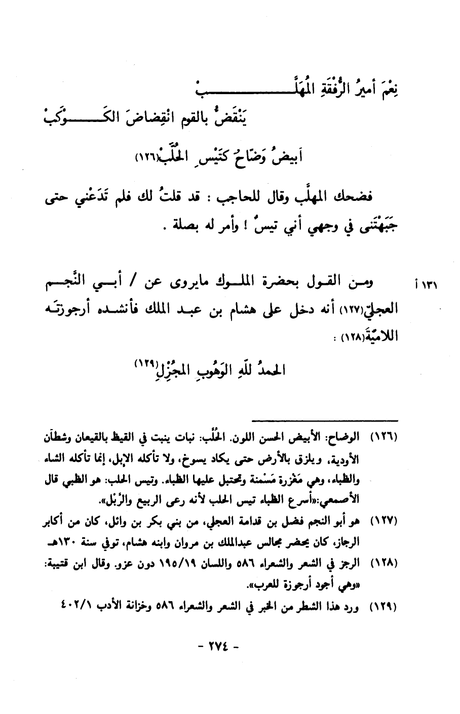 ومن القول بحضرة الملوك ما يروى عن/ أبي النجم العجلي أنه دخل على هشام بن عبد الملك فأنشده أرجوزته اللامية: