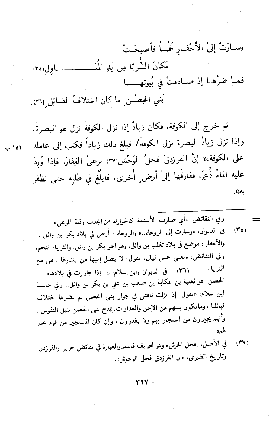 ثم خرج إلى الكوفة, فكان زيادٌ إذا نزل الكوفة نزل هو البصرة, وإذا نزل زيادٌ البصرة نزل الكوفة/ فبلغ ذلك زياداً فكتب إلى عامله على الكوفة: ((إن الفرزدق فحل الوحش يرعى القفار, فإذا ورد عليه الماء ذعر, ففارقها إلى أرضٍ أخرى, فابلغ في طلبه حتى تظفر به)).