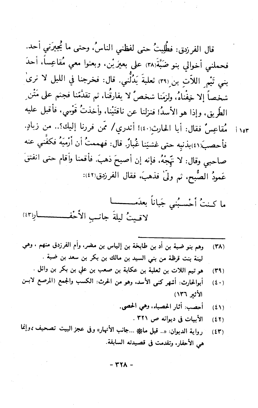 قال الفرزدق: فطلبت حتى لفظني الناس وحتى ما يجيرني أحد. فحملني أخوالي بنو ضبة على بعيرين, وبعثوا معي مقاعساً, أحد بني تيم اللات بن ثعلبة يدلني. قال: فخرجنا في الليل لا نرى شخصاً إلا خفناه, ولزمنا شخصٌ لا يفارقنا, ثم تقدمنا فجثم على متن الطريق, وإذا هو الأسد! فنزلنا عن ناقتينا, وأخذت قوسي, فأقبل عليه مقاعسٌ فقال: أبا الحارث! أتدري/ ممن فررنا إليك؟.. من زيادٍ.فأحصب بذنبه حتى غشينا غبارٌ. قال: فهممت أن أرميه فكفني عنه صاحبي وقال: لا تهجه, فإنه إن أصبح ذهب. فأقمنا وأقام حتى انفتق عمود الصبح، ثم ولى فذهب، فقال الفرزذق: