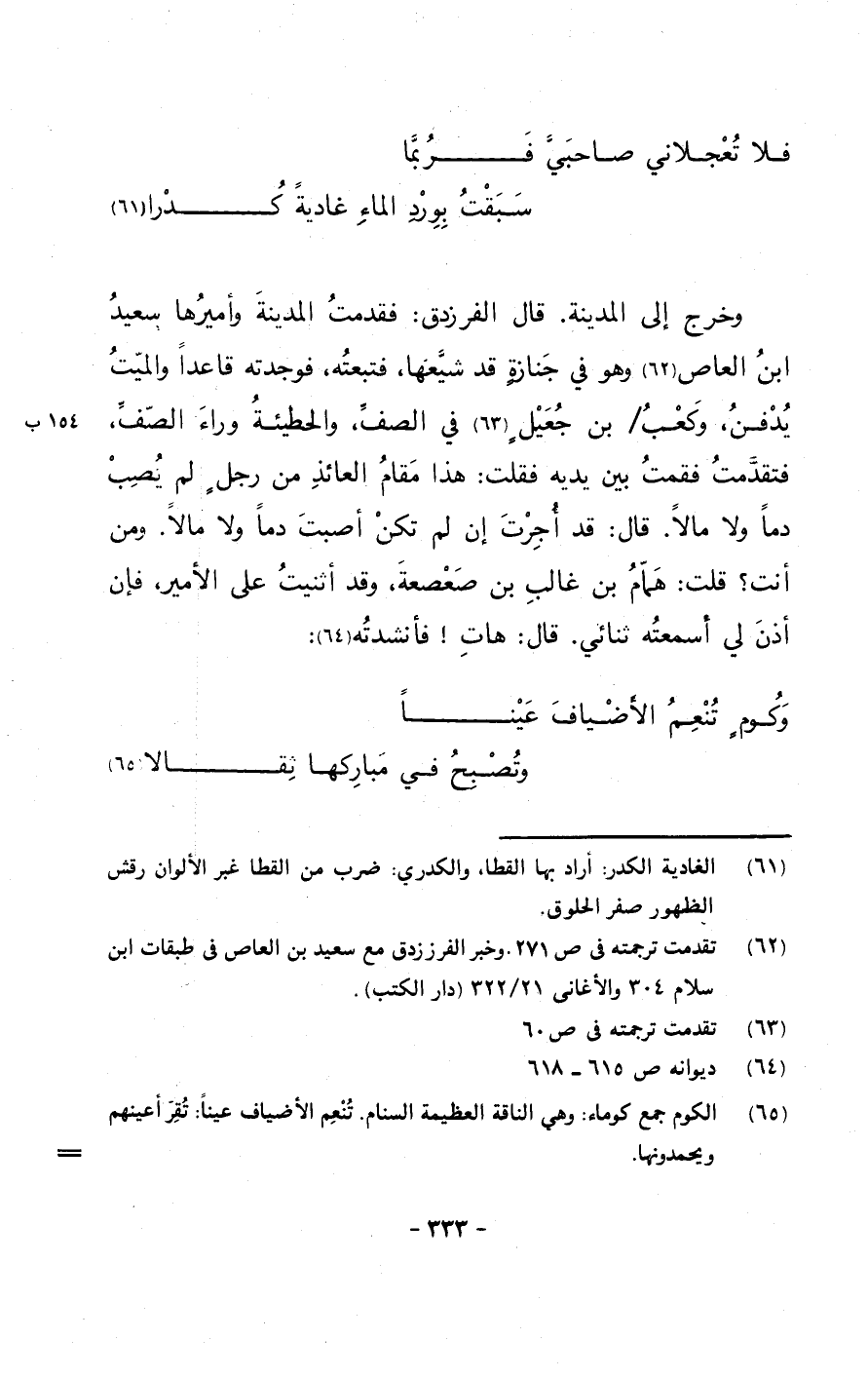 وخرج إلى المدينة. قال الفرزدق: فقدمت المدينة وأميرها سعيد ابن العاص وهو في جنازةٍ قد شيعها، فتبعته، فوجدته قاعداً والميت يدفن، وكعب/ بن جعيلٍ في الصف، والحطيئة وراء الصف، فتقدمت فقمت بين يديه فقلت: هذا مقام العائذ من رجلٍ لم يصب دماً ولا مالاً. قال: قد أجرت إن لم تكن أصبت دماً ولا مالاً. ومن أنت؟ قلت: همام بن غالب بن صعصعة، وقد أثنيت على الأمير، فإن أذن لي أسمعته ثنائي. قال: هات! فأنشدته: