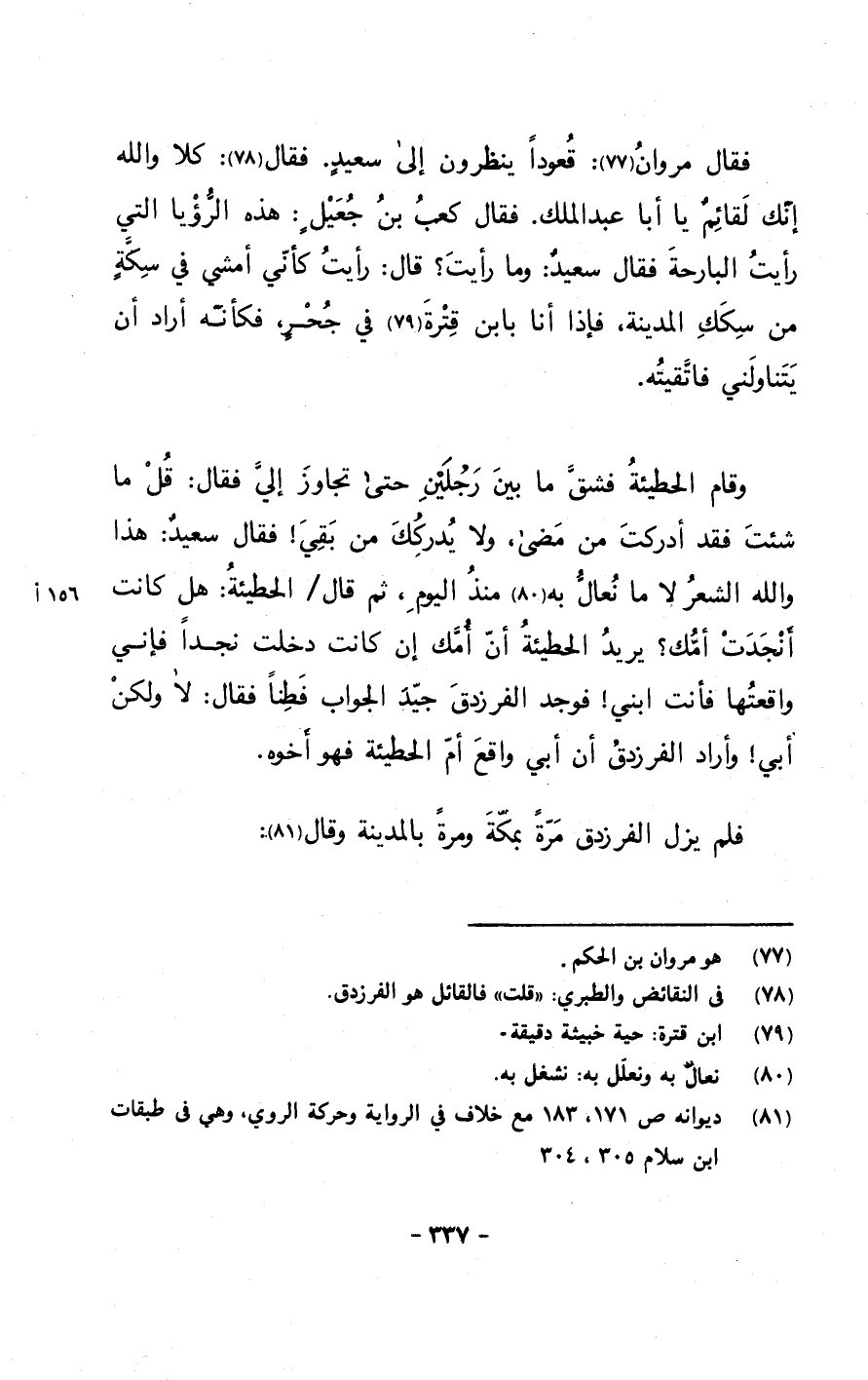 وقام الحطيئة فشق ما بين رجلين حتى تجاوز إلي فقال: قل ما شئت فقد أدركت من مضى، ولا يدركك من بقي! فقال سعيدٌ: هذا والله الشعر لا ما نعال به منذ اليوم، ثم قال/ الحطيئة: هل كانت أنجدت أمك؟ يريد الحطيئة أن أمك إن كانت دخلت نجداً فإني واقعتها فأنت ابني! فوجد الفرزدق جيد الجواب فطناً فقال: لا ولكن أبي! وأراد الفرزدق أن أبي واقع أم الحطيئة فهو أخوه.