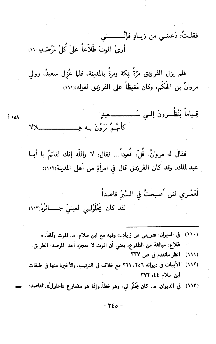 فقال له مروان: قل: قعوداً.. .. فقال: لا والله إنك لقائمٌ يا أبا عبد الملك. وقد كان الفرزدق قال في امرأةٍ من أهل المدينة: