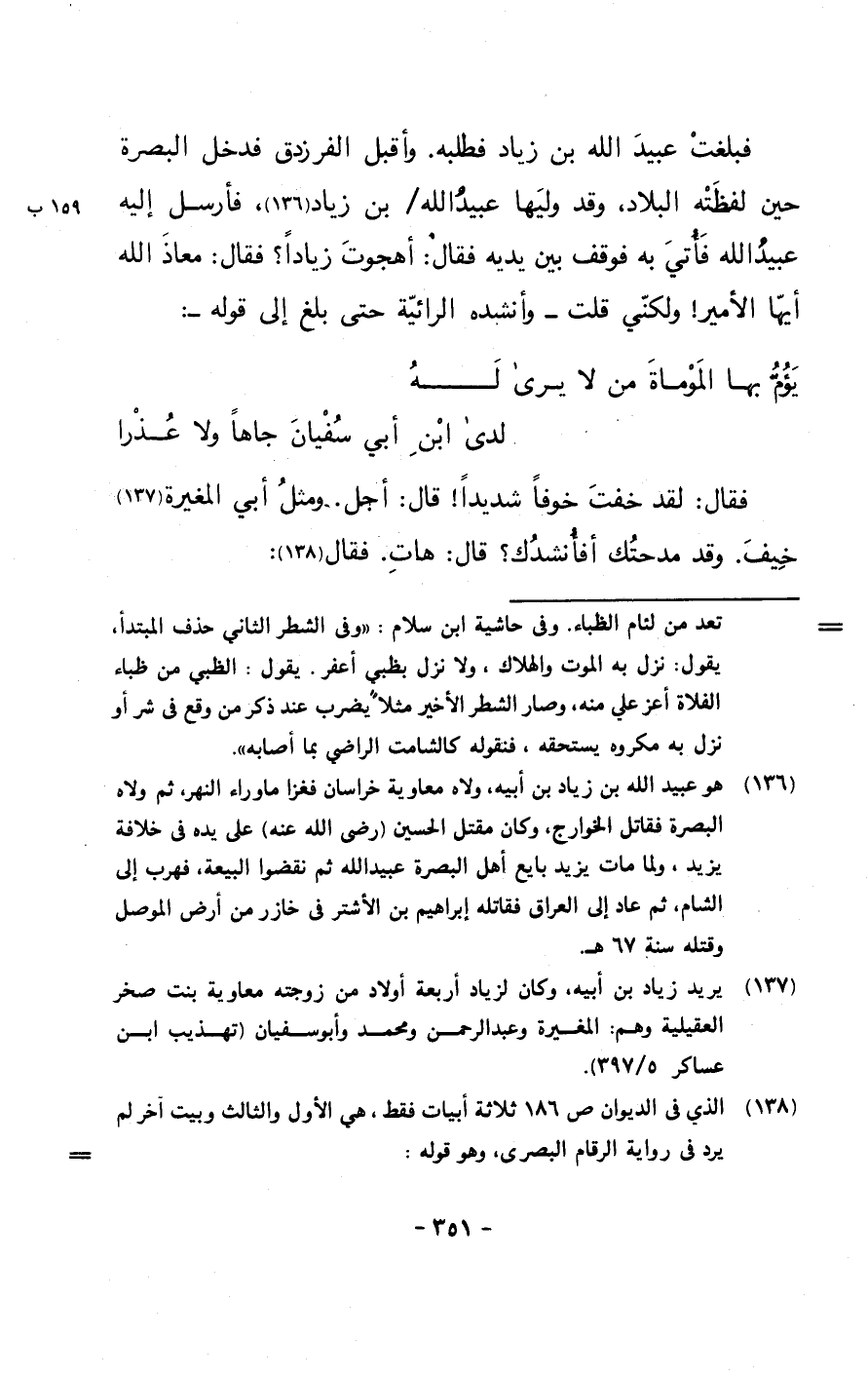 فبلغت عبيد الله بن زياد فطلبه. وأقبل الفرزدق فدخل البصرة حين لفظته البلاد، وقد وليها عبيد الله/ بن زياد، فأرسل إليه عبيد الله فأتي به فوقف بين يديه فقال: أهجوت زياداً؟ فقال: معاذ الله أيها الأمير! ولكني قلت -وأنشده الرائية حتى بلغ إلى قوله-: