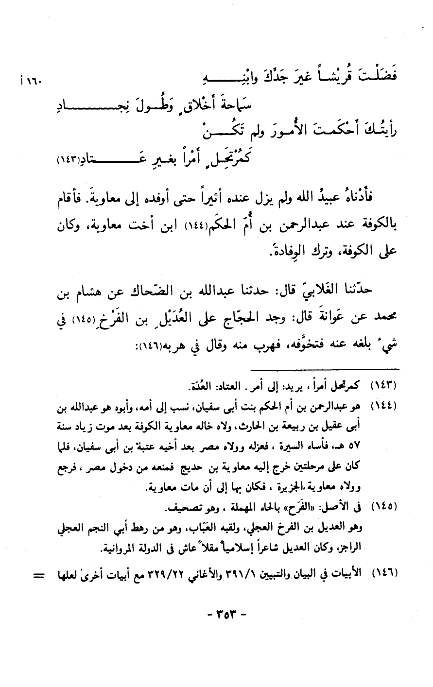 حدثنا الغلابي قال: حدثنا عبد الله بن الضحاك عن هشام بن محمد عن عوانة قال: وجد الحجاج على العديل بن الفرخ في شيء بلغه عنه فتخوفه، فهرب منه وقال في هربه: