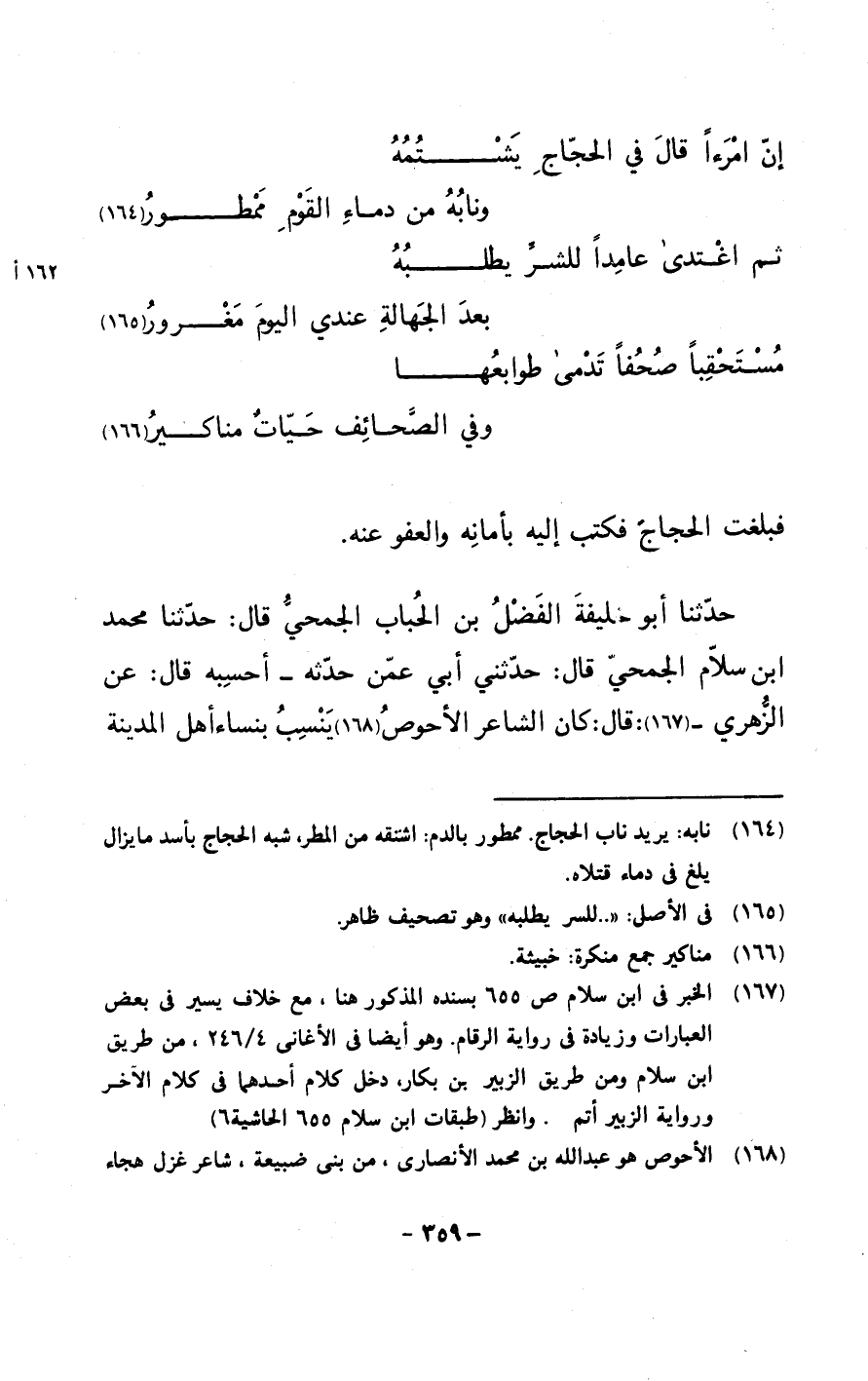 حدثنا أبو خليفة الفضل بن الحباب الجمحي قال: حدثنا محمد ابن سلام الجمحي قال: حدثني أبي عمن حدثه -أحسبه قال: عن الزهري-: قال: كان الشاعر الأحوص ينسب بنساء أهل المدينة