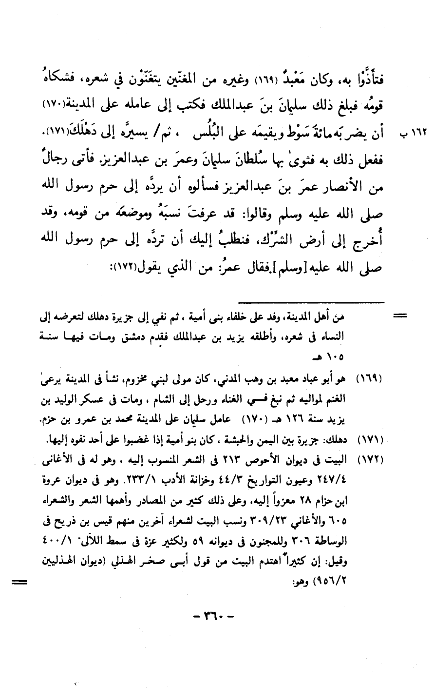 فتأذوا به، وكان معبدٌ وغيره من المغنين يتغنون في شعره، فشكاه قومه فبلغ ذلك سليمان بن عبد الملك فكتب إلى عامله على المدينة أن يضربه مائة سوط ويقيمه على البلس، ثم/ يسيره إلى دهلك. ففعل ذلك به فثوى بها سلطان سليمان وعمر بن عبد العزيز. فأتى رجالٌ من الأنصار عمر بن عبد العزيز فسألوه أن يرده إلى حرم رسول الله صلى الله عليه وسلم وقالوا: قد عرفت نسبه وموضعه من قومه، وقد أخرج إلى أرض الشرك، فنطلب إليك أن ترده إلى حرم رسول الله صلى الله عليه وسلم . فقال عمر: من الذي يقول: