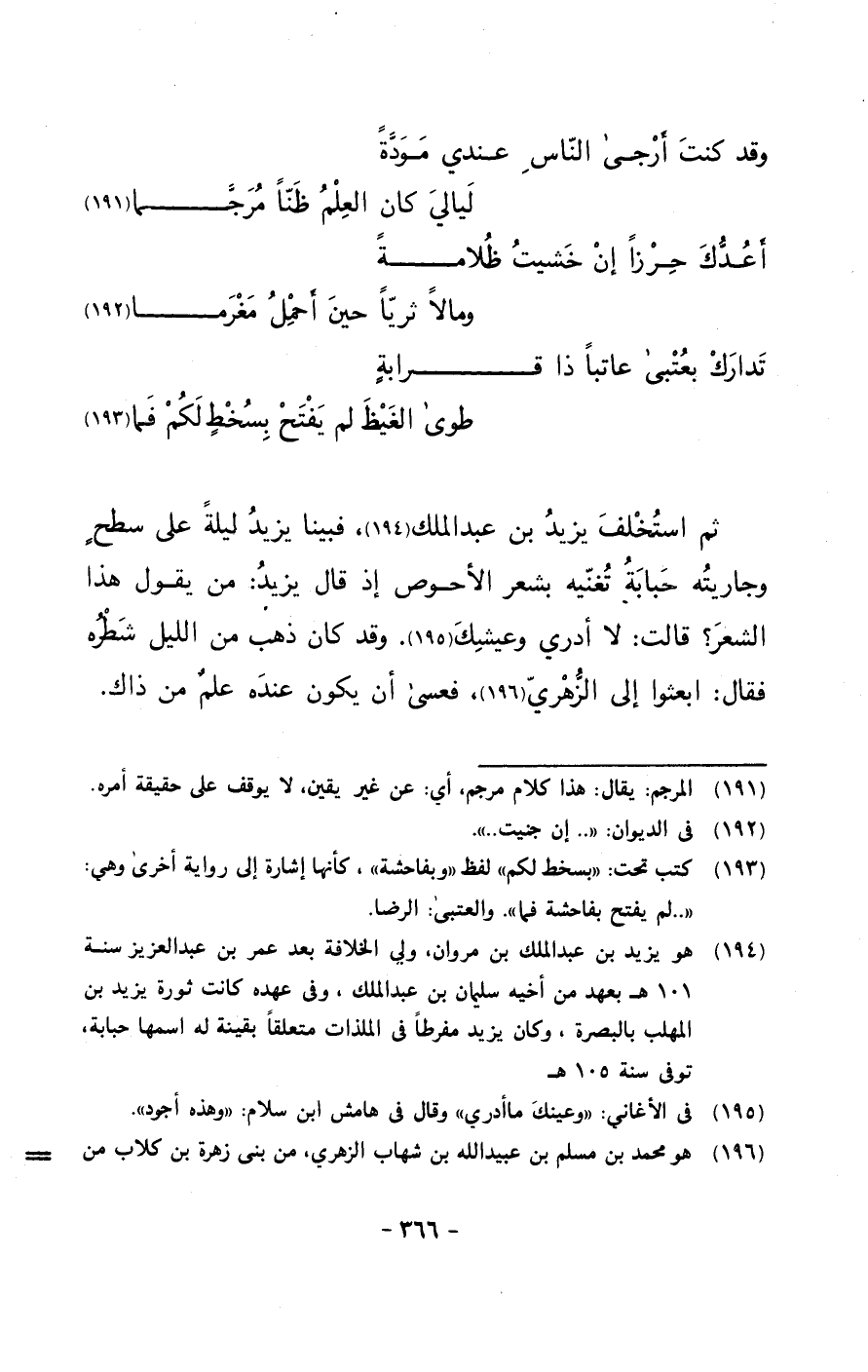 ثم استخلف يزيد بن عبد الملك، فبينا يزيد ليلةً على سطحٍ وجاريته حبابة تغنيه بشعر الأحوص إذ قال يزيد: من يقول هذا الشعر؟ قالت: لا أدري وعيشك. وقد كان ذهب من الليل شطره فقال: ابعثوا إلى الزهري، فعسى أن يكون عنده علمٌ من ذاك.
