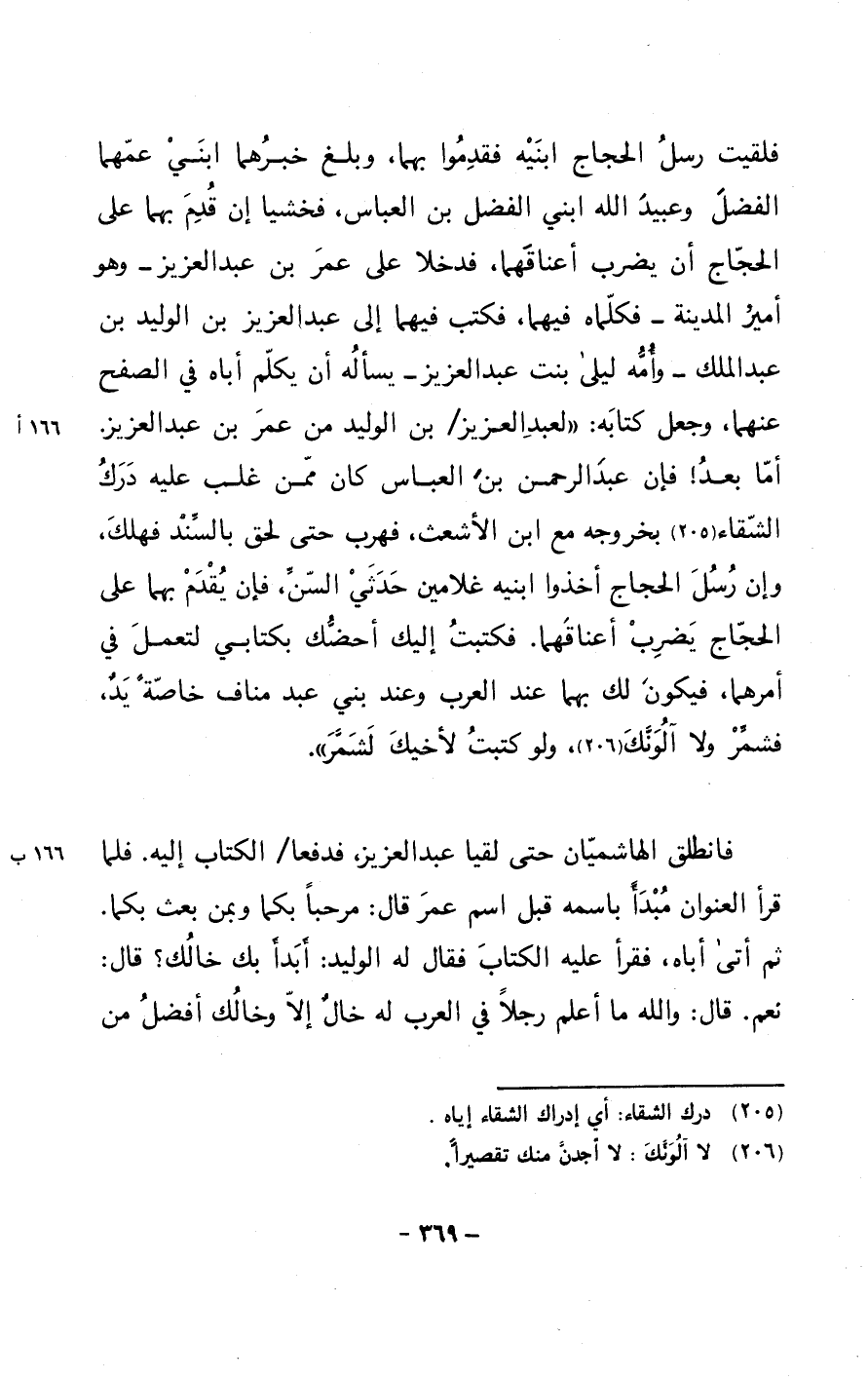 فانطلق الهاشميان حتى لقيا عبد العزيز, فدفعا/ الكتاب إليه. فلما قرأ العنوان مبدأ باسمه قبل اسم عمر قال: مرحباً بكما وبمن بعث بكما. ثم أتى أباه, فقرأ عليه الكتاب فقال له الوليد: أبدأ بك خالك؟ قال: نعم. قال: والله ما أعلم رجلاً في العرب له خالٌ إلا وخالك أفضل من