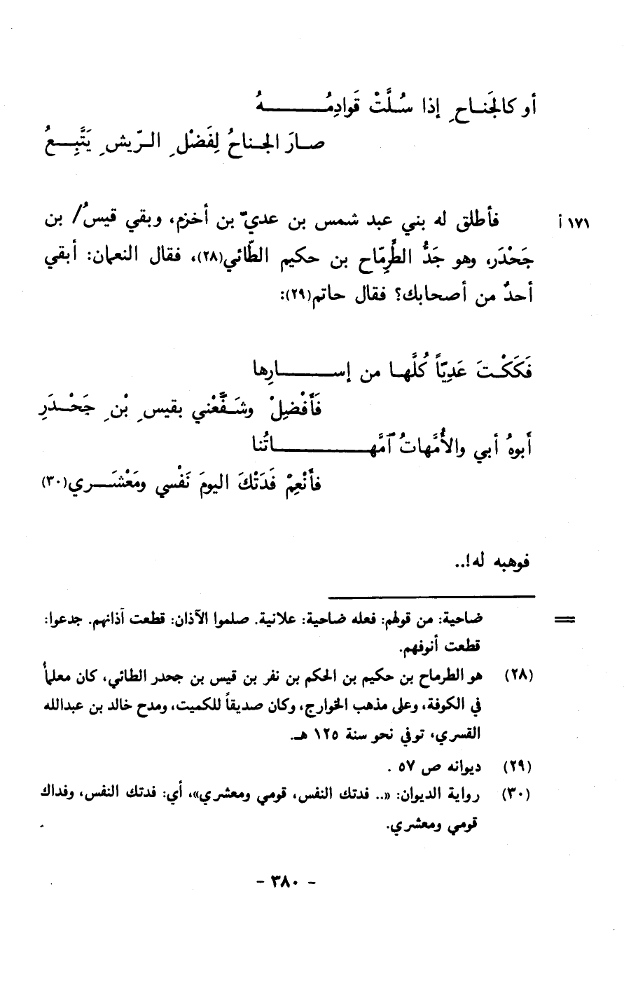 فأطلق له بني عبد شمس بن عدي بن أخزم، وبقي قيس/ بن جحدر، وهو جد الطرماح بن حكيم الطائي، فقال النعمان: أبقي أحد من أصحابك؟ فقال حاتم: