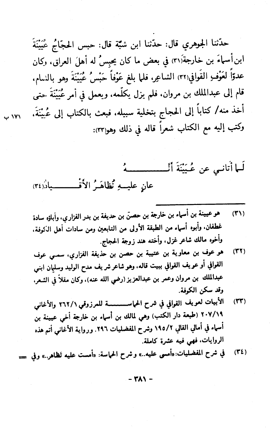 حدثنا الجوهري قال: حدثنا ابن شبة قال: حبس الحجاج عيينة ابن أسماء بن خارجة في بعض ما كان يحبس له أهل العراق، وكان عدواً لعوف القوافي الشاعر، فلما بلغ عوفاً حبس عيينة وهو بالشام, قام إلى عبد الملك بن مروان، فلم يزل يكلمه، ويعمل في أمر عيينة حتى أخذ منه/ كتاباً إلى الحجاج بتخلية سبيله، فبعث بالكتاب إلى عيينة، وكتب إليه مع الكتاب شعراً قاله في ذلك وهو: