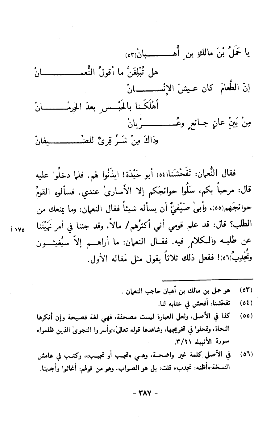 فقال النعمان: تفحشنا أبو حيدة! ايذنوا لهم. فلما دخلوا عليه قال: مرحباً بكم، سلوا حوائجكم إلا الأسارى عندي. فسألوه القوم حوائجهم، وأبى صيفيٌ أن يسأله شيئاً فقال النعمان: وما يمنعك من الطلب؟ قال: قد علم قومي أني أكثرهم/ مالاً، وقد جئنا في أمر نهيتنا عن طلبه والكلام فيه. فقال النعمان: ما أراهم إلا سيغيثون وتجدب! ففعل ذلك ثلاثاً يقول مثل مقاله الأول.
