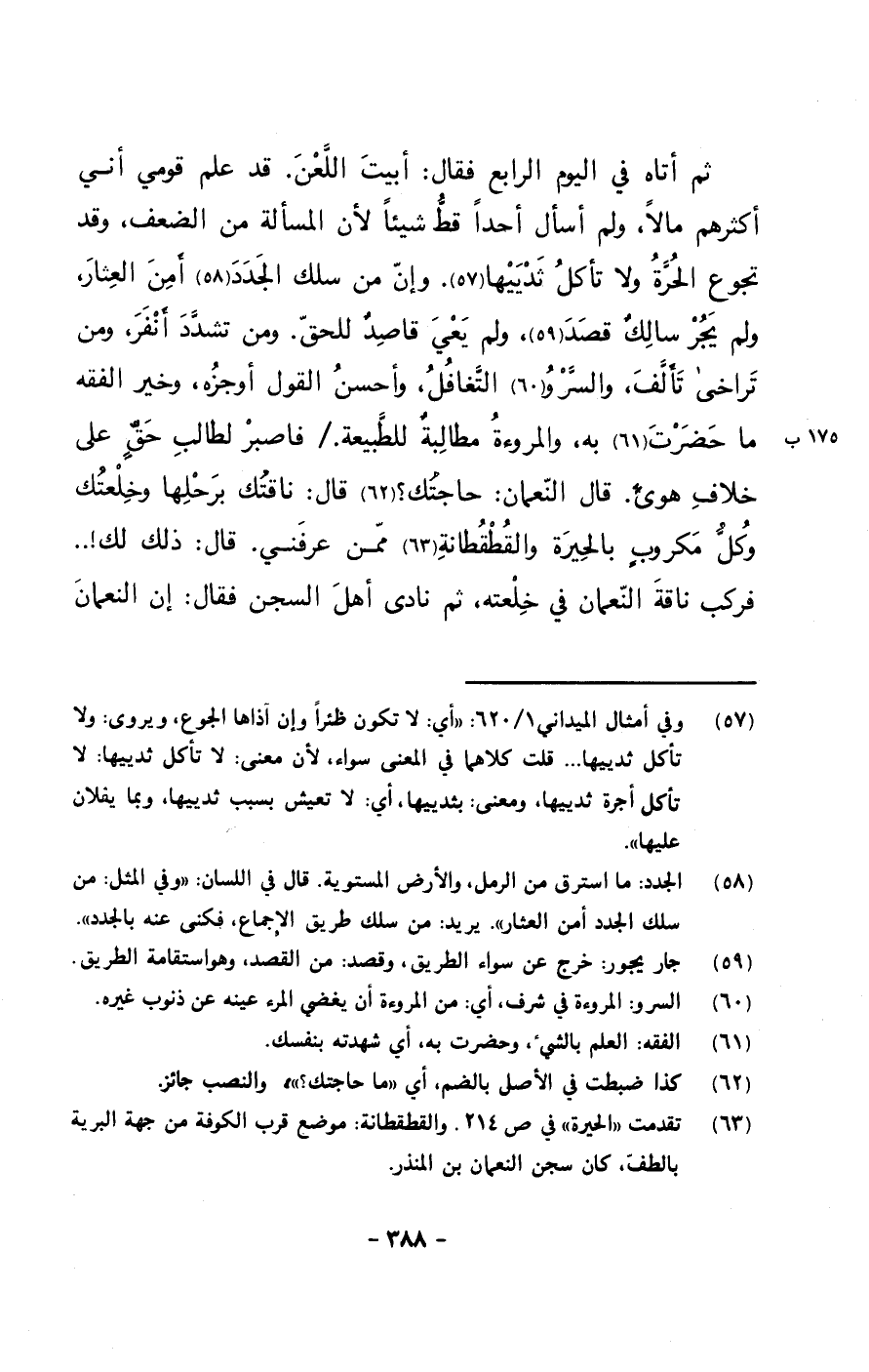 ثم أتاه في اليوم الرابع فقال: أبيت اللعن. قد علم قومي أني أكثرهم مالاً، ولم أسأل أحداً قط شيئاً لأن المسألة من الضعف، وقد تجوع الحرة ولا تأكل ثدييها. وإن من سلك الجدد أمن العثار، ولم يجر سالك قصد، ولم يعي قاصدٌ للحق. ومن تشدد أنفر، ومن تراخى تألف، والسرو التغافل، وأحسن القول أوجزه، وخير الفقه ما حضرت به، والمروءة مطالبةٌ للطبيعة./ فاصبر لطالب حقٍ على خلاف هوىً. قال النعمان: حاجتك؟ قال: ناقتك برحلها وخلعتك وكل مكروبٍ بالحيرة والقطقطانة ممن عرفني. قال: ذلك لك !.. فركب ناقة النعمان في خلعته، ثم نادى أهل السجن فقال: إن النعمان