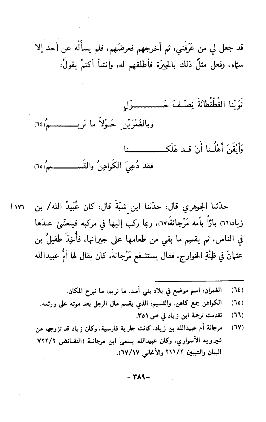 حدثنا الجوهري قال: حدثنا ابن شبة قال: كان عبيد الله/ بن زياد باراً بأمه مرجانة، ربما ركب إليها في مركبه فيتعشى عندها في الناس، ثم يقسم ما بقي من طعامها على جيرانها، فأخذ طفيل بن عثمان في ظنة الخوارج، فقال يستشفع مرجانة، كان يقال لها أم عبيد الله