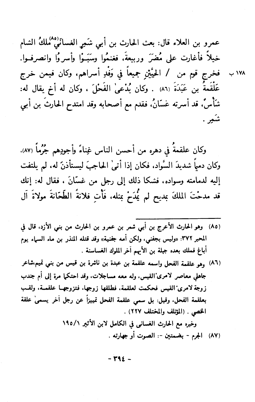 عمرو بن العلاء قال: بعث الحارث بن أبي شمرٍ الغساني ملك الشام خيلاً فأغارت على مضر وربيعة، فغنموا وسبوا وأسروا وانصرفوا. فخرج قوم من/ الحيين جميعاً في وفد أسراهم، وكان فيمن خرج علقمة بن عبدة وكان يدعى الفحل وكان له أخ يقال له: شأسٌ، قد أسرته غسان، فقدم مع أصحابه وقد امتدح الحارث بن أبي شمر.