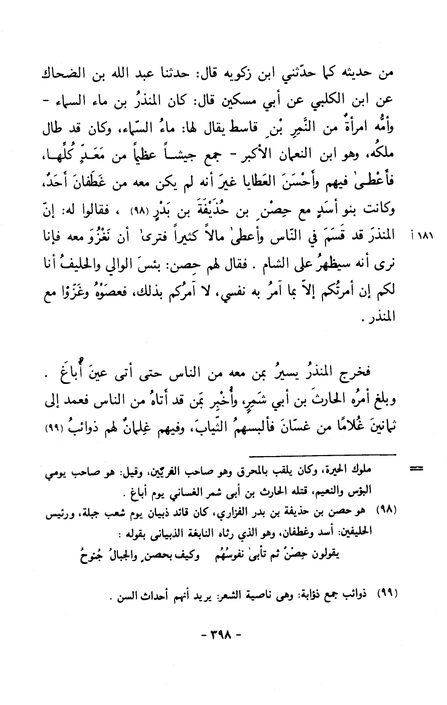 من حديثه كما حدثني ابن زكويه قال: حدثنا عبد الله بن الضحاك عن ابن الكلبي عن أبي مسكين قال: كان المنذر بن ماء السماء -وأمه امرأة من النمر بن قاسط يقال لها: ماء السماء، وكان قد طال ملكه، وهو ابن النعمان الأكبر- جمع جيشاً عظيماً من معدٍ كلها، فأعطى فيهم وأحسن العطايا غير أنه لم يكن معه من غطفان أحدٌ، وكانت بنو أسدٍ مع حصن بن حذيفة بن بدرٍ، فقالوا له: إن المنذر قد قسم في الناس وأعطى مالاً كثيراً فترى أن نغزو معه فإنا نرى أنه سيظهر على الشام. فقال لهم حصن: بئس الوالي والحليف أنا لكم إن أمرتكم إلا بما آمر به نفسي، لا آمركم بذلك، فعصوه وغزوا مع المنذر.