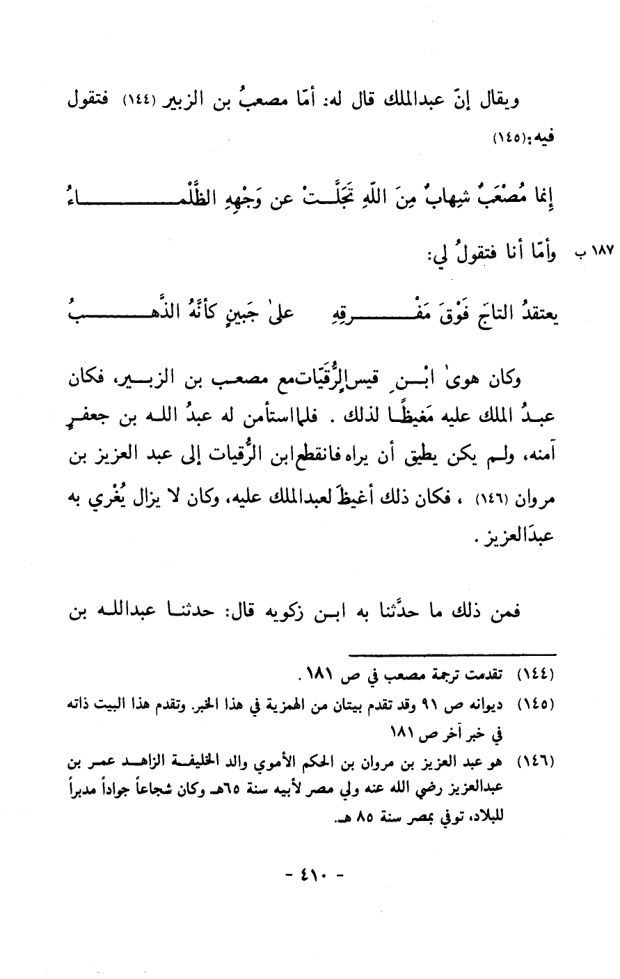 ويقال إن عبد الملك قال له: أما مصعب بن الزبير فتقول فيه: