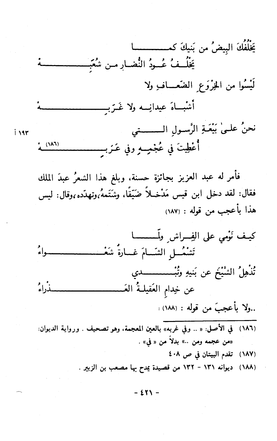 فأمر له عبد العزيز بجائزة حسنة, وبلغ هذا الشعر عبد الملك فقال: لقد دخل ابن قيس مدخلاً ضيقاً, وشتمه, وتهدده, وقال: ليس هذا بأعجب من قوله: