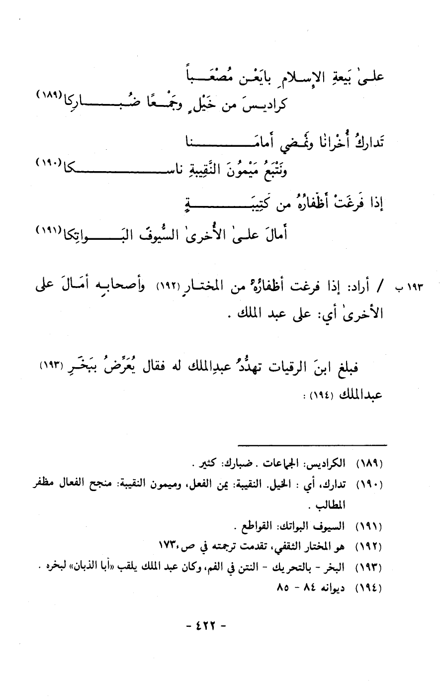 على بيعة الإسلام بايعن مصعبا ... كراديس من خيلٍ وجمعاً ضباركا