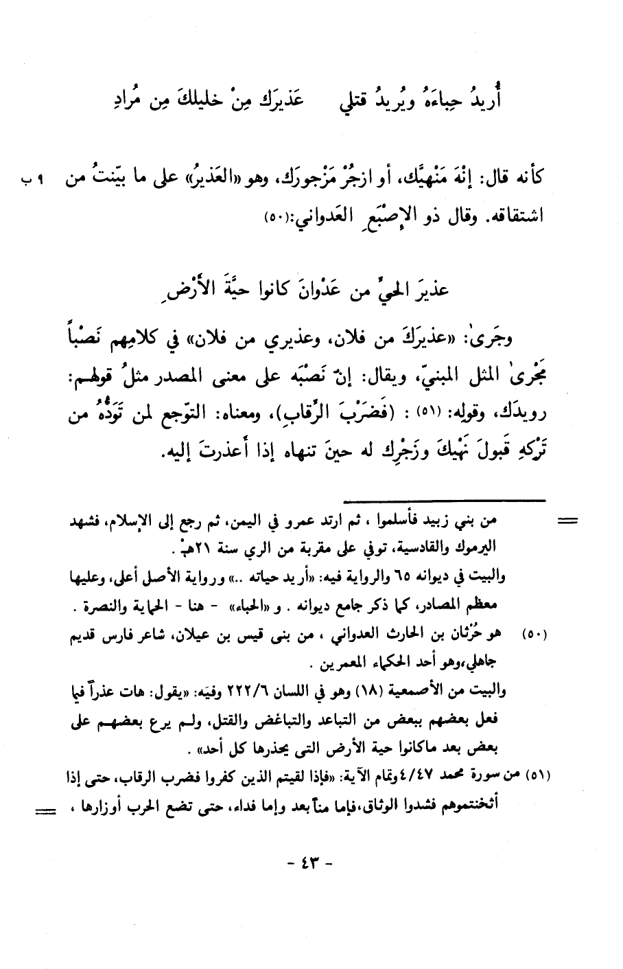 وجرى: ((عذيرك من فلان، وعذيري من فلان)) في كلامهم نصباً مجرى المثل المبني، ويقال: إن نصبه على معنى المصدر مثل قولهم: رويدك، وقوله: (فضرب الرقاب)، ومعناه: التوجع لمن توده من تركه قبول نهيك وزجرك له حين تنهاه إذا أعذرت إليه.