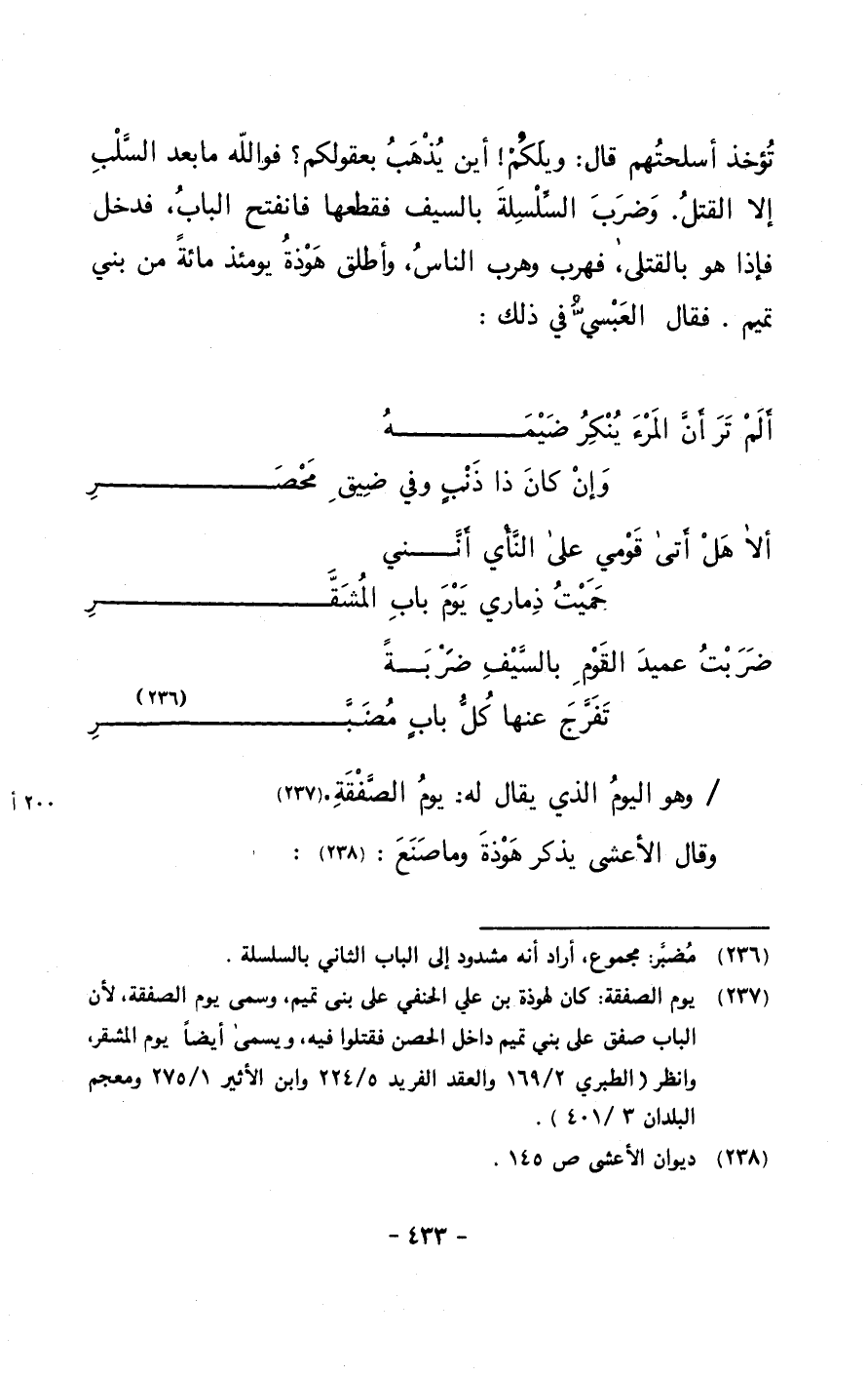 تؤخذ أسلحتهم قال: ويلكم! أين يذهب بعقولكم؟ فوالله ما بعد السلب إلا القتل. وضرب السلسلة بالسيف فقطعها فانفتح الباب, فدخل فإذا هو بالقتلى, فهرب وهرب الناس, وأطلق هوذة يومئذ مائةً من بني تميم. فقال العبسي في ذلك: