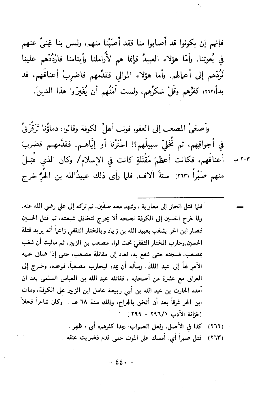 وأصغى المصعب إلى العفو، فوثب أهل الكوفة وقالوا: دماؤنا ترقرق في أجوافهم، ثم تخلي سبيلهم؟! اخترنا أو إياهم. فقدمهم فضرب أعناقهم، فكانت أعظم مقتلةٍ كانت في الإسلام/ وكان الذي قتل منهم صبراً ستة آلاف. فلما رأى ذلك عبيد الله بن الحر خرج