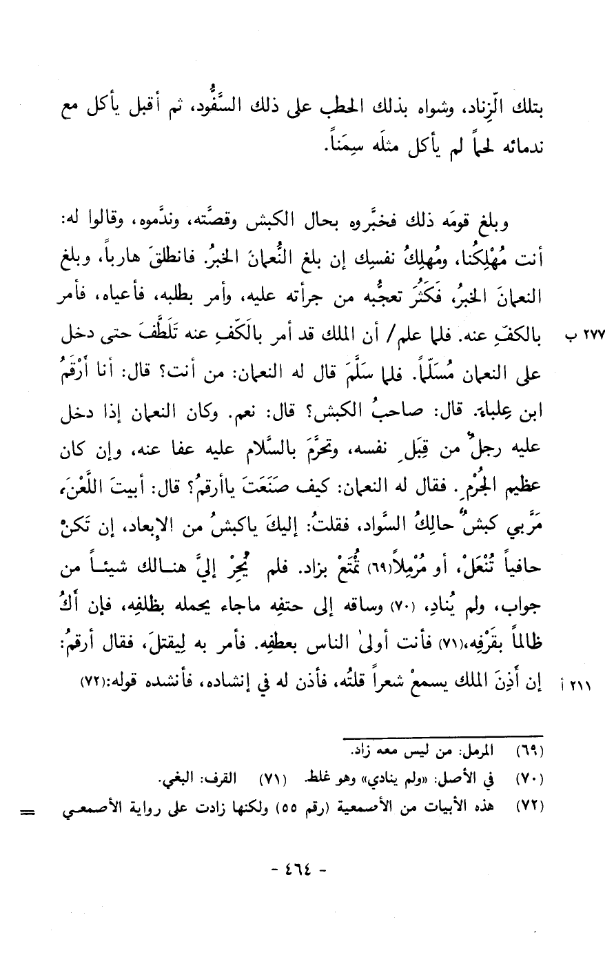 وبلغ قومه ذلك فخبروه بحال الكبش وقصته، وندموه، وقالوا له: أنت مهلكنا، ومهلك نفسك إن بلغ النعمان الخبر. فانطلق هارباً، وبلغ النعمان الخبر، فكثر تعجبه من جرأته عليه، وأمر بطلبه، فأعياه، فأمر بالكف عنه. فلما علم/ أن الملك قد أمر بالكف عنه تلطف حتى دخل على النعمان مسلماً. فلما سلم قال له النعمان: من أنت؟ قال: أنا أرقم ابن علباء. قال: صاحب الكبش؟ قال: نعم. وكان النعمان إذا دخل عليه رجلٌ من قبل نفسه، وتحرم بالسلام عليه عفا عنه، وإن كان عظيم الجرم. فقال له النعمان: كيف صنعت يا أرقم؟ قال: أبيت اللعن، مربي كبشٌ حالك السواد، فقلت: إليك يا كبش من الإبعاد، إن تكن حافياً تنعل، أو مرملاً تمتع بزاد. فلم يحر إلي هنالك شيئاً من جوابٍ، ولم يناد، وساقه إلى حتفه ما جاء يحمله بظلفه، فإن أك ظالماً بقرفه، فأنت أولى الناس بعطفه. فأمر به ليقتل، فقال أرقم: إن أذن الملك يسمع شعراً قلته، فأذن له في إنشاده، فأنشده قوله: