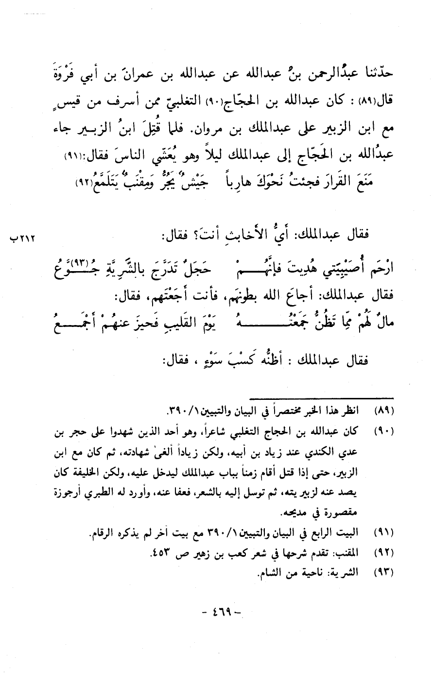 حدثنا عبد الرحمن بن عبد الله عن عبد الله بن عمران بن أبي فروة قال: كان عبد الله بن الحجاج التغلبي ممن أسرف من قيسٍ مع ابن الزبير على عبد الملك بن مروان. فلما قتل ابن الزبير جاء عبد الله بن الحجاج إلى عبد الملك ليلاً وهو يعشي الناس فقال: