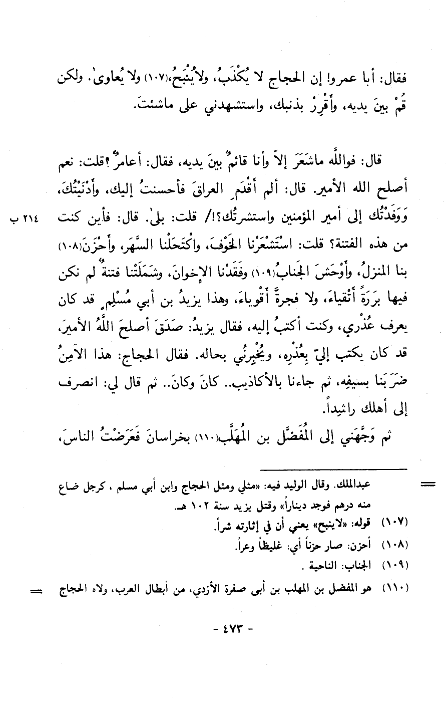 قال: فوالله ما شعر إلا وأنا قائمٌ بين يديه، فقال: أعامر؟ قلت: نعم أصلح الله الأمير. قال: ألم أقدم العراق فأحسنت إليك، وأدنيتك، ووفدتك إلى أمير المؤمنين واستشرتك؟!/ قلت: بلى. قال: فأين كنت من هذه الفتنة؟ قلت: استشعرنا الخوف، واكتحلنا السهر، وأحزن بنا المنزل، وأوحش الجناب وفقدنا الإخوان، وشملتنا فتنةٌ لم نكن فيها بررة أتقياء، ولا فجرةً أقوياء، وهذا يزيد بن أبي مسلمٍ قد كان يعرف عذري، وكنت أكتب إليه، فقال يزيد: صدق أصلح الله الأمير، قد كان يكتب إلي بعذره، ويخبرني بحاله. فقال الحجاج: هذا الآمن ضربنا بسيفه، ثم جاءنا بالأكاذيب.. كان وكان.. ثم قال لي: انصرف إلى أهلك راشداً.