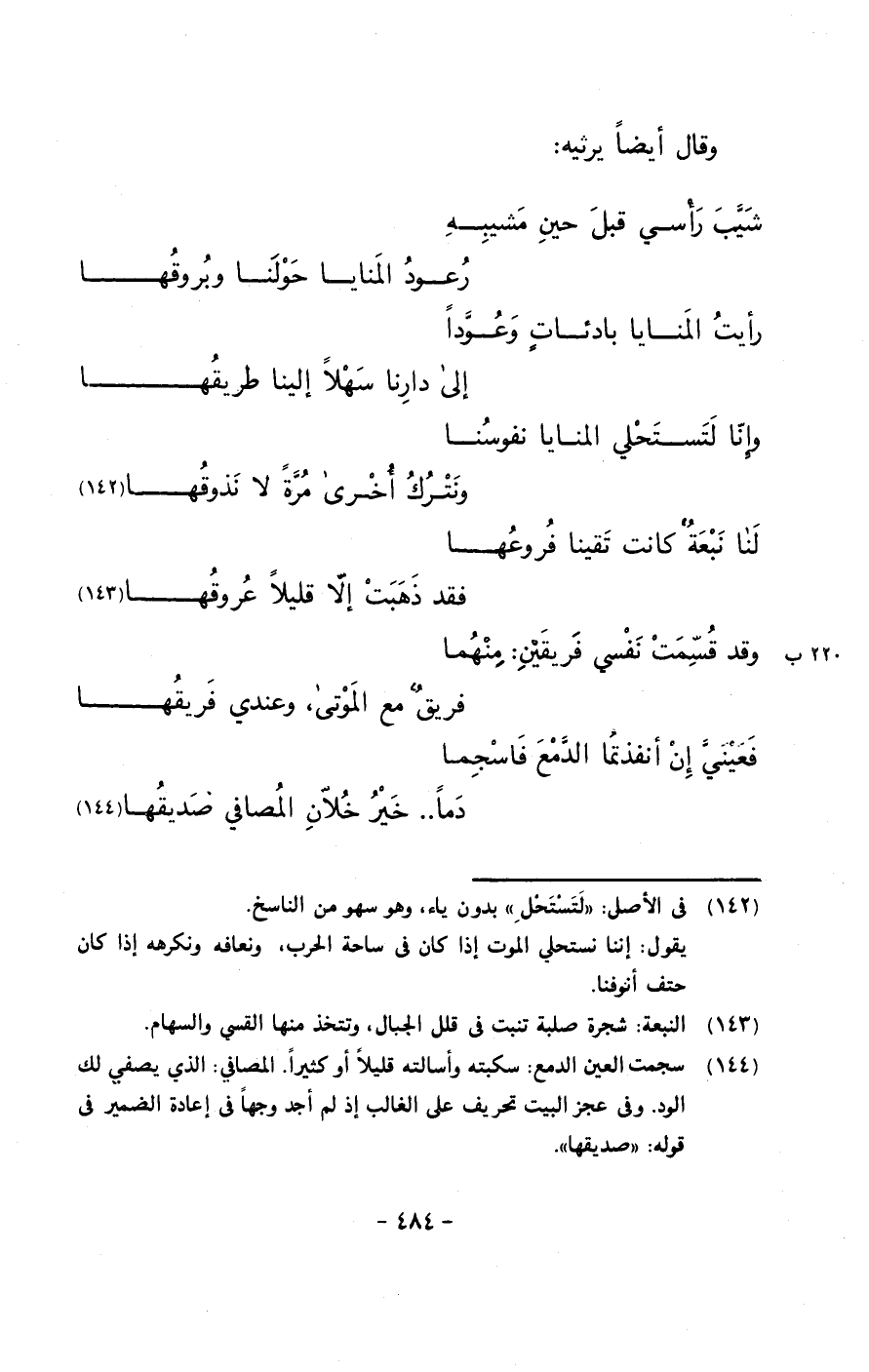 فعيني إن أنفذتما الدمعة فاسجما ... دماً.. .. خير خلان المصافي صديقها