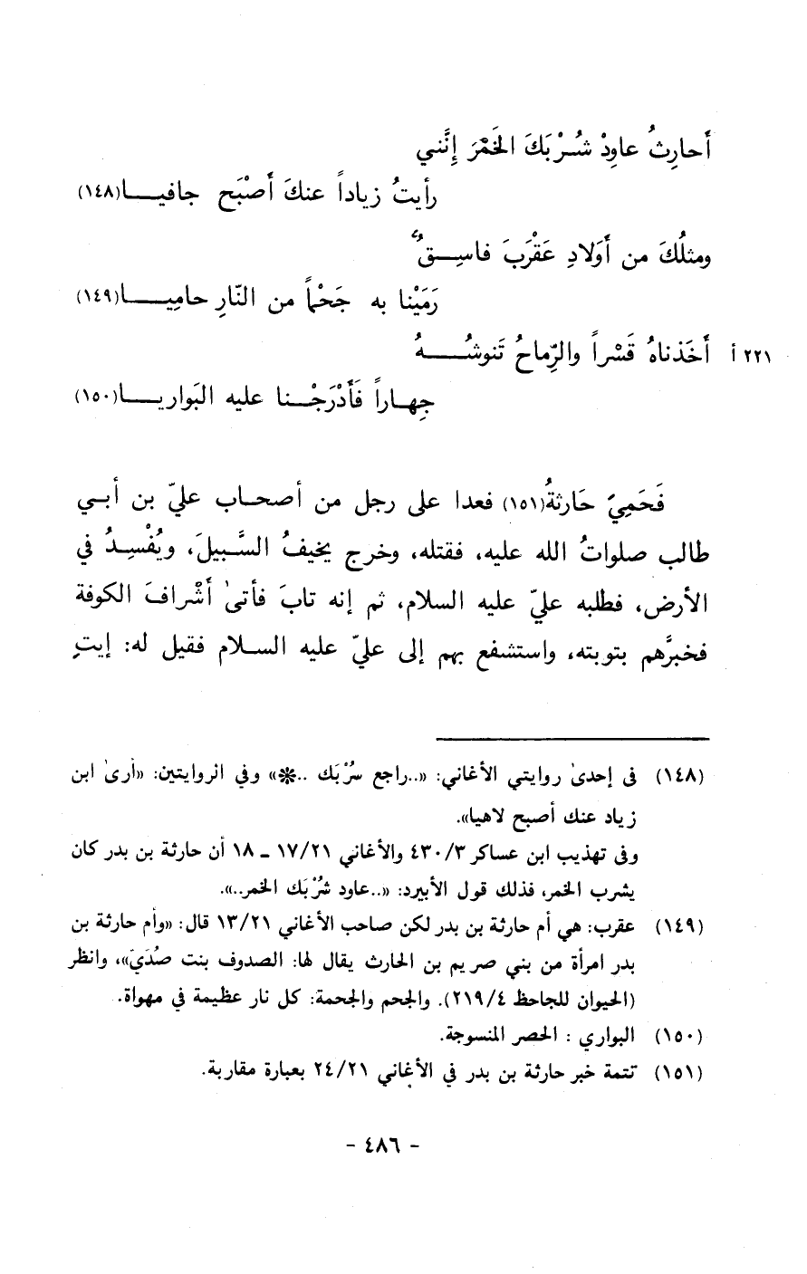 فحمي حارثة فعدا على رجل من أصحاب علي بن أبي طالب صلوات الله عليه, فقتله, وخرج يخيف السبيل, ويفسد في الأرض, فطلبه علي عليه السلام, ثم إنه تاب فأتى أشراف الكوفة فخبرهم بتوبته, واستشفع بهم إلى علي عليه السلام فقيل له: إيت