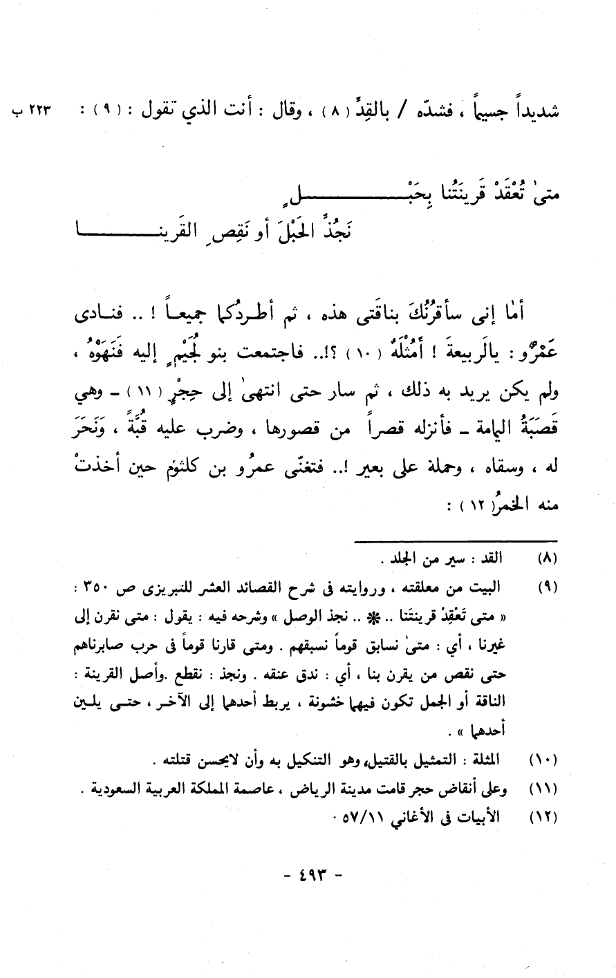 أما إني سأقرنك بناقتي هذه، ثم أطردكما جميعاً!.. فنادى عمرو: يالربيعة! أمثلةٌ؟!.. فاجتمعت بنو لجيمٍ إليه فنهوه، ولم يكن يريد به ذلك، ثم سار حتى انتهى إلى حجرٍ –وهي قصبة اليمامة- فأنزله قصراً من قصورها، وضرب عليه قبةً، ونحر له، وسقاه، وحمله على بعير!.. فتغنى عمرو بن كلثوم حين أخذت منه الخمر: