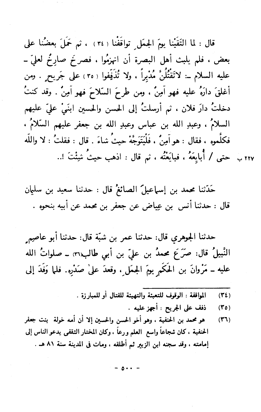 حدثنا الجوهري قال: حدثنا عمر بن شبة قال: حدثنا أبو عاصمٍ النبيل قال: صرع محمد بن علي بن أبي طالب –صلوات الله عليه- مروان بن الحكم يوم الجمل، وقعد على صدره. فلما وفد إلى