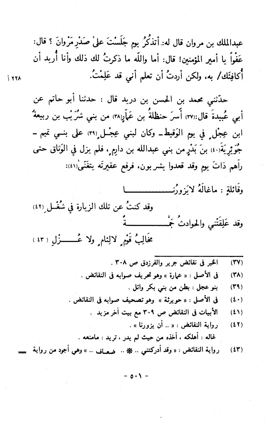 عبد الملك بن مروان قال له: أتذكر يوم جلست على صدر مروان؟ قال: عفواً يا أمير المؤمنين! قال: أما والله ما ذكرت لك ذلك وأنا أريد أن أكافئك/ به، ولكن أردت أن تعلم أني قد علمت.