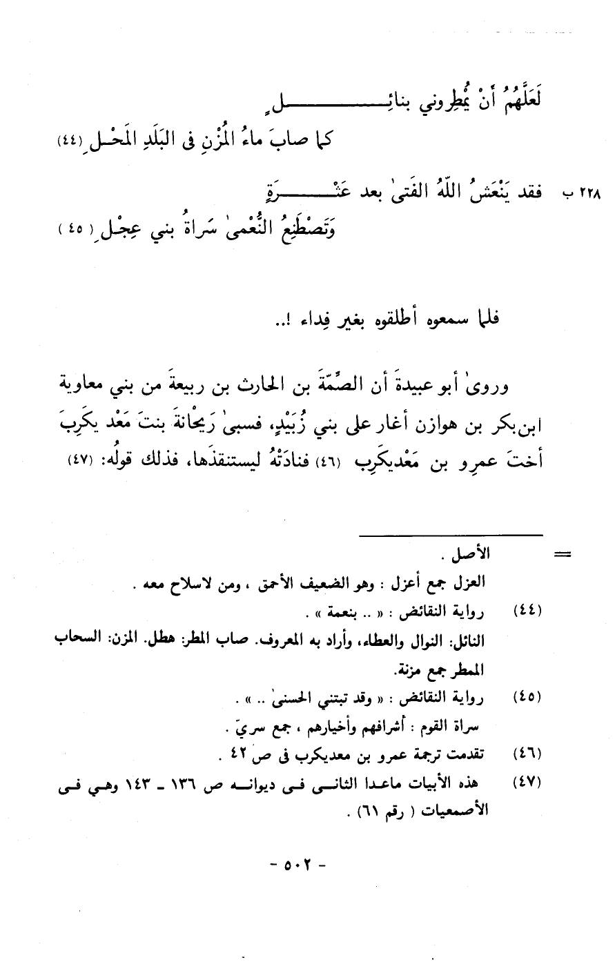 وروى أبو عبيدة أن الصمة بن الحارث بن ربيعة من بني معاوية ابن بكر بن هوازن أغار على بني زبيدٍ، فسبى ريحانة بنت معد يكرب أخت عمرو بن معد يكرب فنادته ليستنقذها، فذلك قوله: