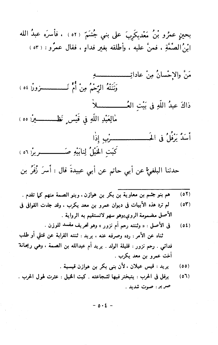 بحينٍ عمرو بن معد يكرب على بني جشم، فأسره عبد الله ابن الصمة، فمن عليه، وأطلقه بغير فداءٍ، فقال عمرٌو: