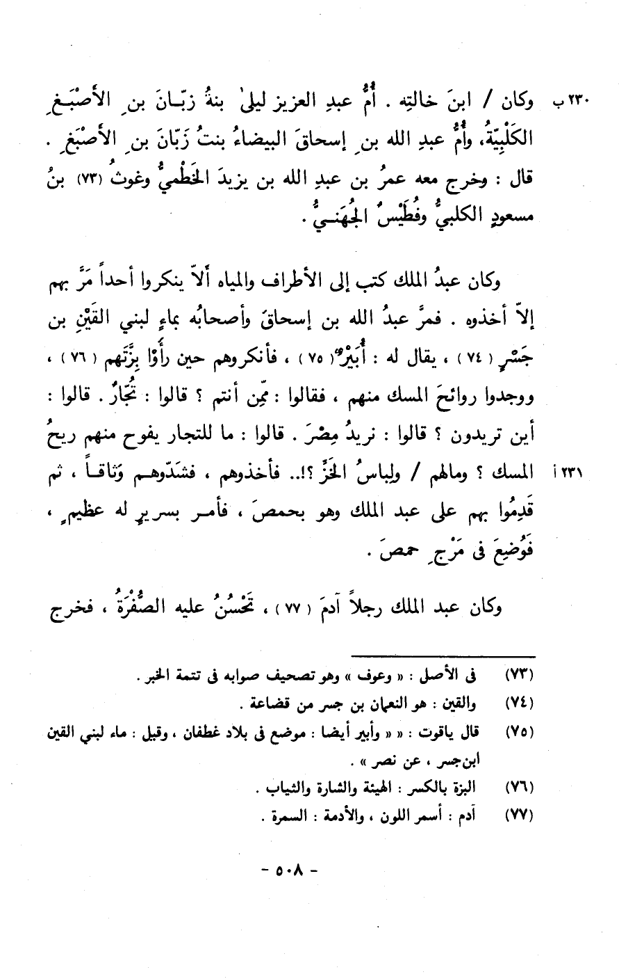 وكان عبد الملك كتب إلى الأطراف والمياه ألا ينكروا أحداً مر بهم إلا أخذوه. فمر عبد الله بن إسحاق وأصحابه بماءٍ لبني القين بن جسرٍ، يقال له: أبيرٌ، فأنكروهم حين رأوا بزتهم، ووجدوا روائح المسك منهم، فقالوا: ممن أنتم؟ قالوا: تجارٌ. قالوا: أين تريدون؟ قالوا: نريد مصر. قالوا: ما للتجار يفوح منهم ريح المسك؟ وما لهم/ ولباس الخز؟!.. فأخذوهم، فشدوهم وثاقاً، ثم قدموا بهم على عبد الملك وهو بحمص، فأمر بسريرٍ له عظيمٍ، فوضع في مرج حمص.
