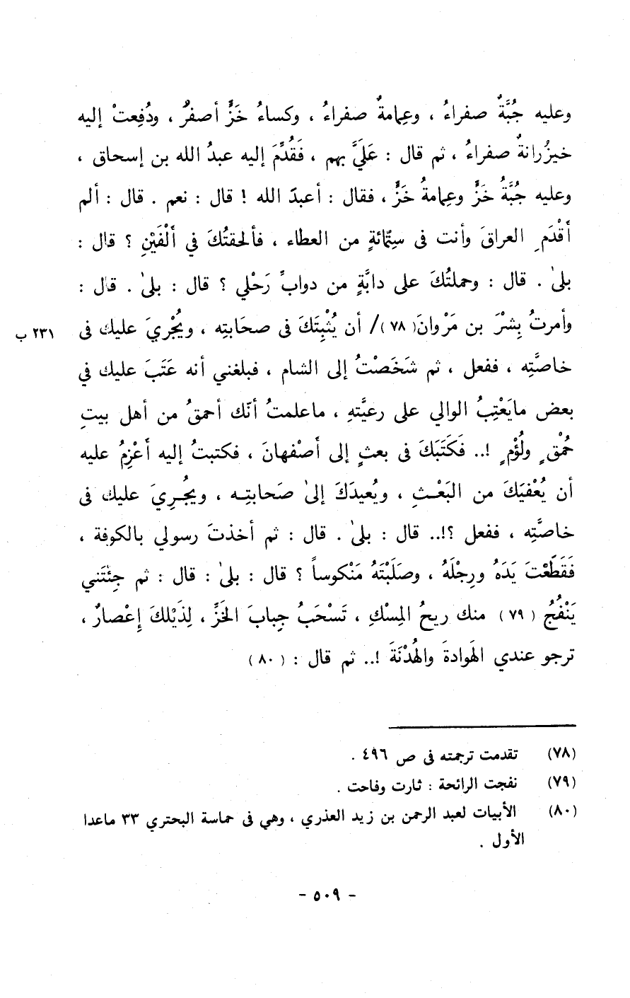 وعليه جبةٌ صفراء، وعمامةٌ صفراء، وكساء خز أصفر، ودفعت إليه خيزرانةٌ صفراء، ثم قال: علي بهم، فقدم إليه عبد الله بن إسحاق، وعليه جبة خز وعمامة خز، فقال: أعبد الله! قال: نعم. قال: ألم أقدم العراق وأنت في ستمائةٍ من العطاء، فألحقتك في ألفين؟ قال: بلى. قال: وحملتك على دابةٍ من دواب رحلي؟ قال: بلى. قال: وأمرت بشر بن مروان/ أن يثبتك في صحابته، ويجري عليك في خاصته، ففعل، ثم شخصت إلى الشام، فبلغني أنه عتب عليك في بعض ما يعتب الوالي على رعيته، ما علمت أنك أحمق من أهل بيت حمقٍ ولؤمٍ!.. فكتبك في بعثٍ إلى أصفهان، فكتبت إليه أعزم عليه أن يعفيك من البعث، ويعيدك إلى صحابته، ويجري عليك في خاصته، ففعل؟!.. قال: بلى. قال: ثم أخذت رسولي بالكوفة، فقطعت يده ورجله، وصلبته منكوساً؟ قال: بلى. قال: ثم جئتني ينفج منك ريح المسك، تسحب جباب الخز، لذيلك إعصارٌ، ترجو عندي الهوادة والهدنة!.. ثم قال: