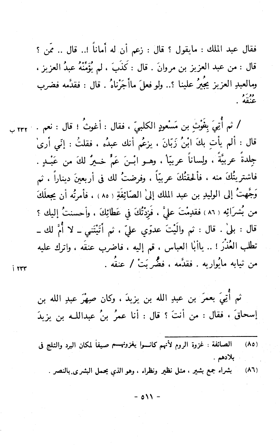 / ثم أتي بغوث بن مسعودٍ الكلبي، فقال: أغوث! قال: نعم. قال: ألم يأت بك ابن زبان، يزعم أنك عبده، فقلت: إني أرى جلدةً عربيةً، ولساناً عربياً، وهو ابن عم خيرٌ لك من عبدٍ. فاشتريتك منه، فألحقتك عربياً، وفرضت لك في أربعين ديناراً، ثم وجهت إلى الوليد بن عبد الملك إلى الصائفة، فأمرته أن يجعلك من بشرائه فقدمت علي، فزدتك في عطائك، وأحسنت إليك؟ قال: بلى. قال: ثم واليت عدوي علي، ثم أتيتني -لا أم لك- تطلب العذر!.. يا أبا العباس، قم إليه، فاضرب عنقه، واترك عليه من ثيابه ما يواريه. فقدمه، فضربت/ عنقه.