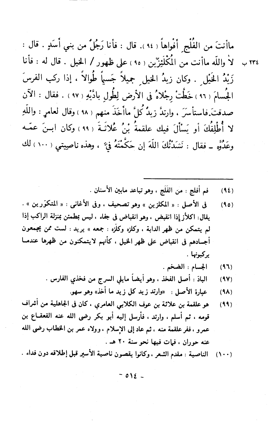 ما أنت من الفلج أفواهاً. قال: فأنا رجلٌ من بني أسدٍ. قال: لا والله ما أنت من المكلئزين على ظهور/ الخيل. قال له: فأنا زيد الخيل. وكان زيد الخيل جميلاً جسيماً طوالاً, إذا ركب الفرس الجسام خطت رجلاه في الأرض لطول باديه. فقال: الآن صدقت. فاستأسر، وارتد زيد كل ما أخذ منهم وقال لعامرٍ: والله لا أطلقك أو يسأل فيك علقمة بن علاثة وكان ابن عمه وعدوه- فقال: نشدتك الله إن حكمته في، وهذه ناصيتي لك